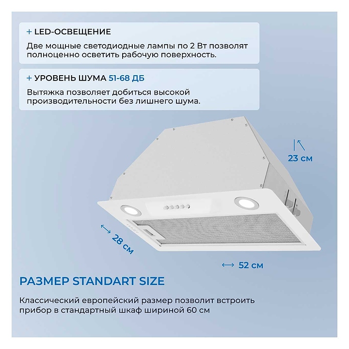 Кухонная вытяжка Zugel ZHI522W используется в домашних условиях для очистки воздуха от продуктов горения, копоти и запахов в процессе приготовления пищи путем принудительной вентиляции. Модель оснащена электронным управлением с кнопками. Светодиодные лампы гарантируют яркое и равномерное освещение рабочей зоны. Корпус выполнен из крашеной стали, жировой фильтр - из алюминия. В комплект поставки входит жироулавливающий фильтр. Особенности: