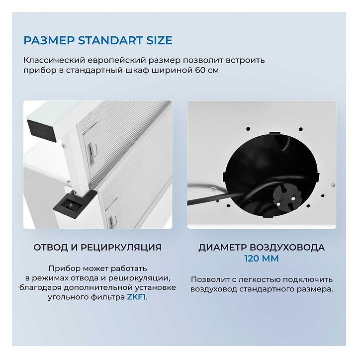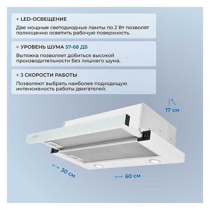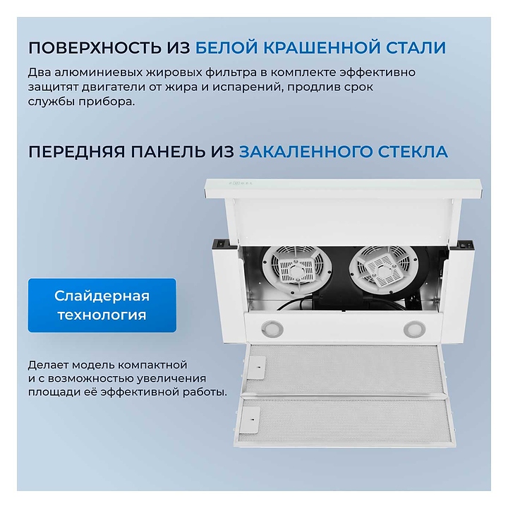 Кухонная вытяжка Zugel ZHT651GW используется в домашних условиях для очистки воздуха от продуктов горения, копоти и запахов в процессе приготовления пищи путем принудительной вентиляции. Модель оснащена электронным кнопочным управлением и 3 скоростями. Слайдерная технология гарантирует компактность и позволяет увеличить площадь эффективной работы. Светодиодные лампы гарантируют яркое и равномерное освещение рабочей зоны. Корпус выполнен из крашеной стали, панель - из закаленного стекла, жировой фильтр - из алюминия. В комплект поставки входят 2 жироулавливающих фильтра. Особенности: