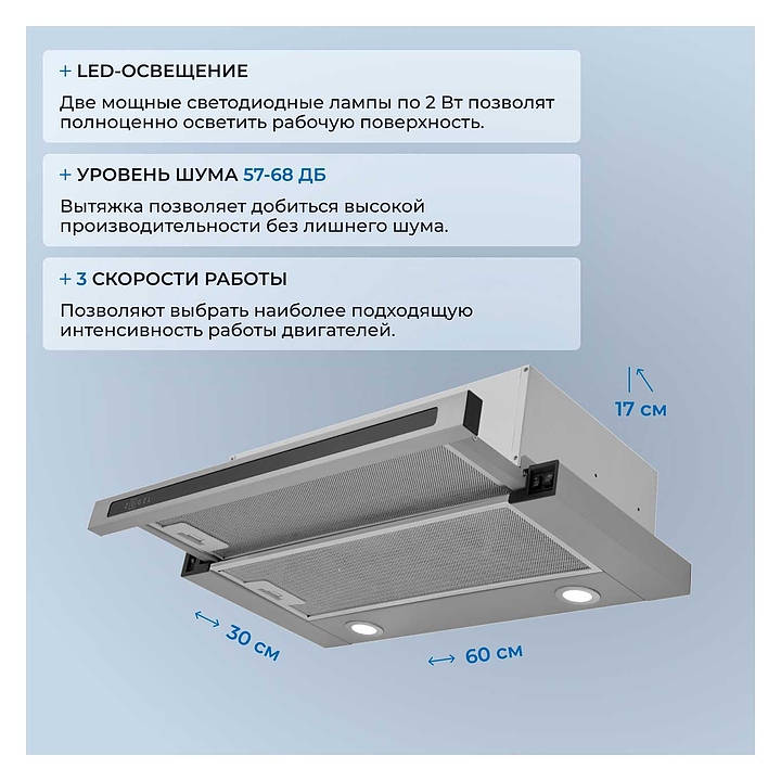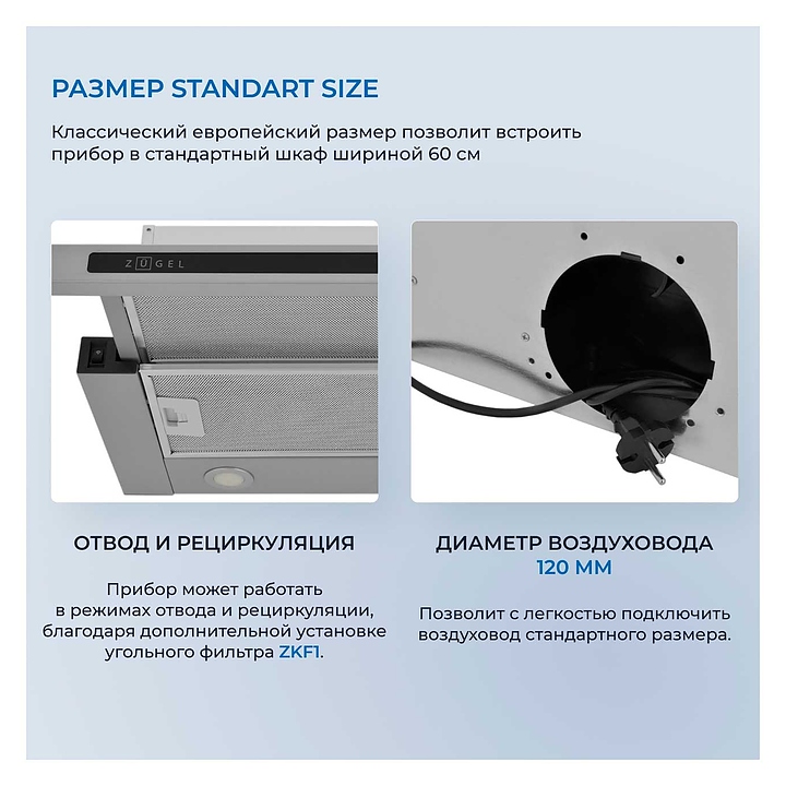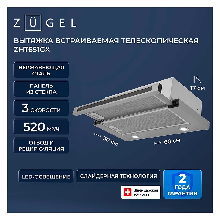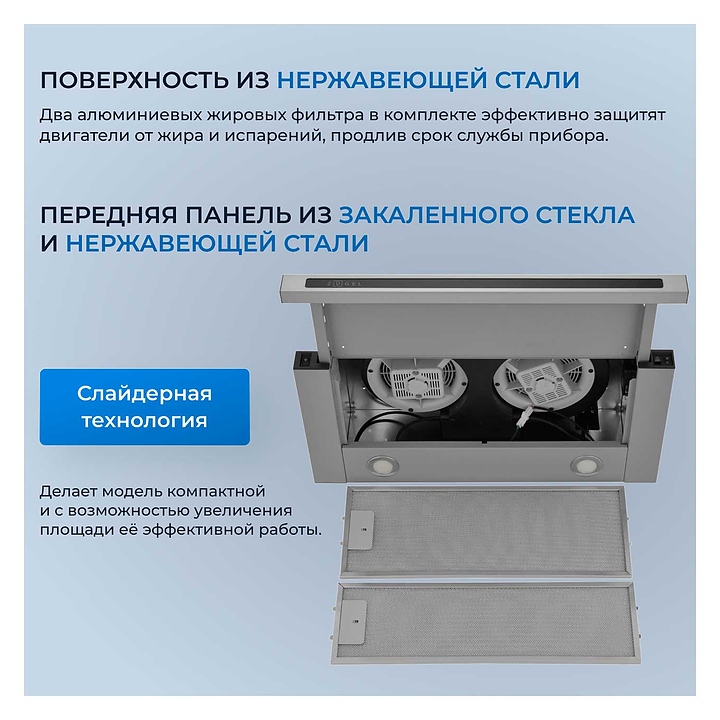Кухонная вытяжка Zugel ZHT651GX используется в домашних условиях для очистки воздуха от продуктов горения, копоти и запахов в процессе приготовления пищи путем принудительной вентиляции. Модель оснащена электронным кнопочным управлением и 3 скоростями. Слайдерная технология гарантирует компактность и позволяет увеличить площадь эффективной работы. Светодиодные лампы гарантируют яркое и равномерное освещение рабочей зоны. Корпус выполнен из стали, панель - из закаленного стекла, жировой фильтр - из алюминия. В комплект поставки входят 2 жироулавливающих фильтра. Особенности: