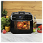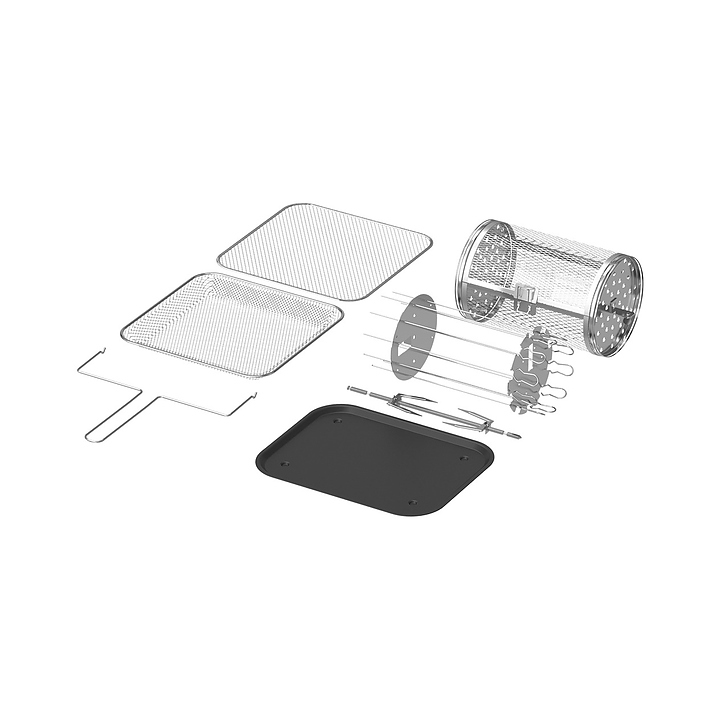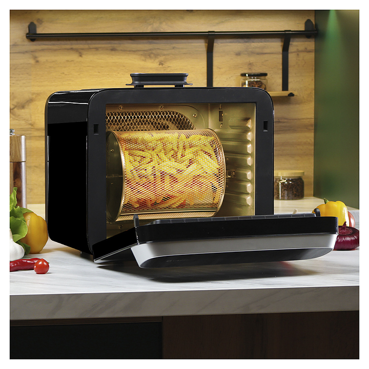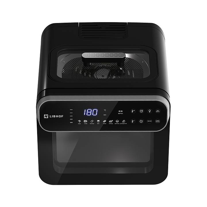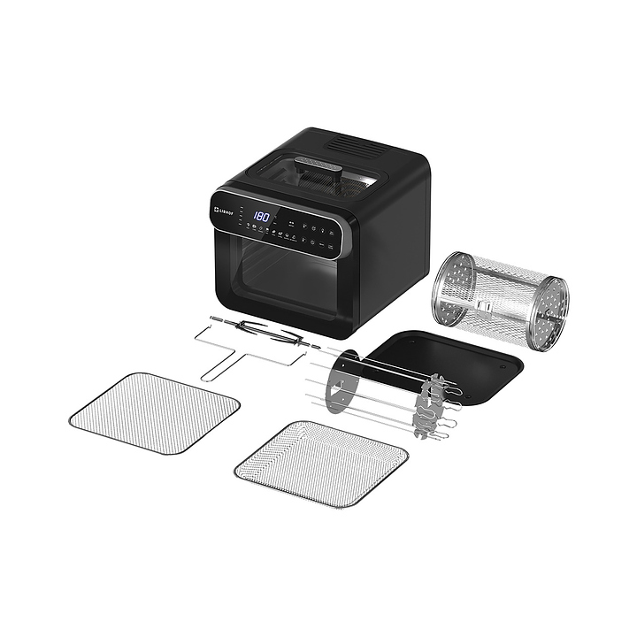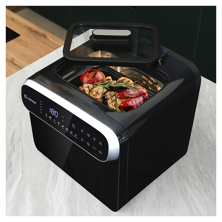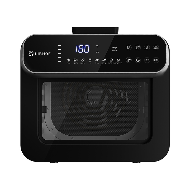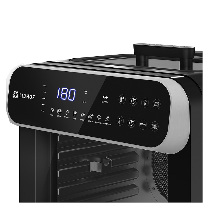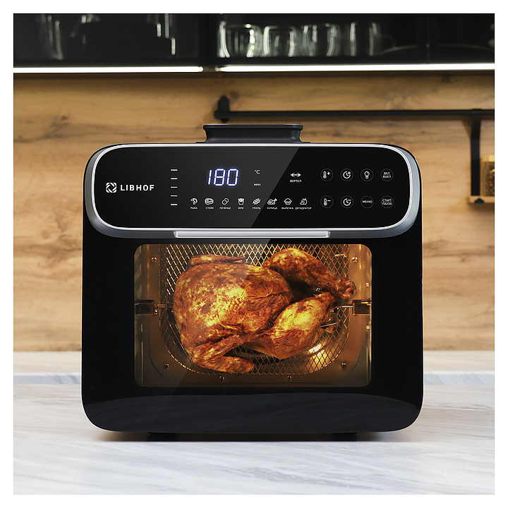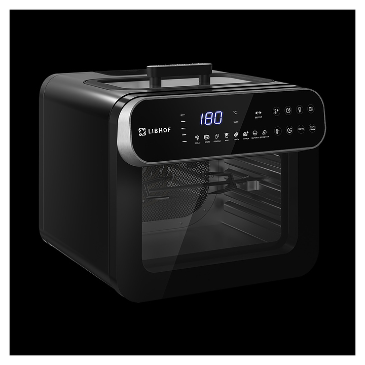 Электрический аэрогриль Libhof AFZ-14 используется в домашних условиях для приготовления различных блюд с хрустящей корочкой без использования масла либо с добавлением небольшого его количества благодаря принудительной циркуляции горячего воздуха в камере. Модель оснащена трубчатым нагревательным элементом в верхней части, распашной дверцей и съемной крышкой-окном, кабелем питания с вилкой, электронной панелью управления с сенсорными функциональными клавишами и цифровым дисплеем индикации. Корпус выполнен из ударопрочного пластика черного цвета, антипригарное тефлоновое покрытие камеры. В комплект поставки входят аэрогриль, поддон для сбора жира, сетчатые поддоны-2 шт, корзина для фритюра, вертел, вращающаяся корзина, шашлычница, съемник вертела, инструкция, книга рецептов. Особенности: