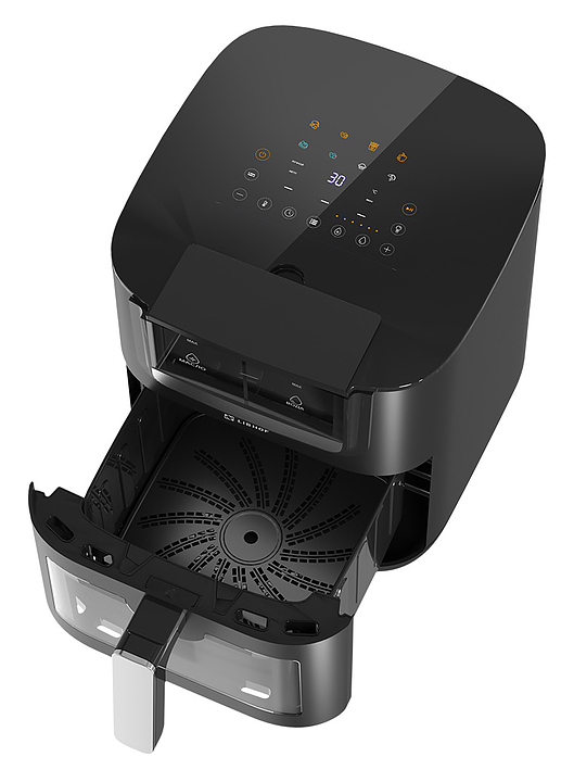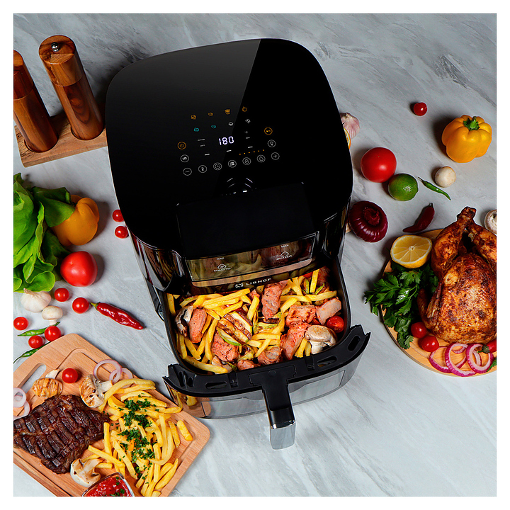 Электрический аэрогриль Libhof AFR-07 используется в домашних условиях для приготовления различных блюд с хрустящей корочкой без использования масла либо с добавлением небольшого его количества благодаря принудительной циркуляции горячего воздуха в камере. Модель оснащена трубчатым нагревательным элементом в верхней части, выдвижной чашей с ручкой, кабелем питания с вилкой, электронной панелью управления с сенсорными функциональными клавишами и цифровым дисплеем индикации. Корпус выполнен из ударопрочного пластика черного цвета, антипригарное тефлоновое покрытие чаши. В комплект поставки входят аэрогриль, противень, инструкция. Особенности: