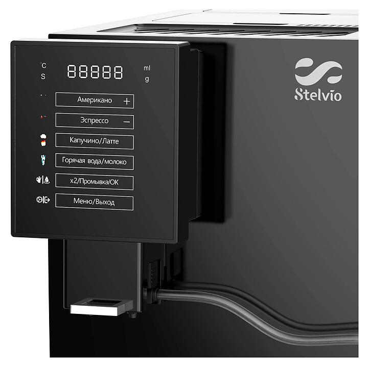Кофемашина Stelvio AX 100 B используется в домашних условиях для приготовления кофе и напитков на его основе. Модель оснащена сенсорным дисплеем, подсветкой кнопок управления, встроенной кофемолкой с 5 степенями помола, автоматическим капучинатором и съемными резервуарами для молока, использованного кофе и капель. Функция самоочистки и режим автоматической промывки облегчают уход. Фронтальная панель выполнена из стекла и пластика, корпус - из металла, пластика и нержавеющей стали, жернова и решетка каплесборника - из нержавеющей стали. Особенности: