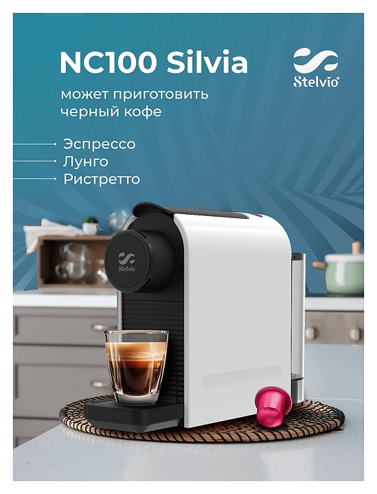 Капсульная кофемашина Stelvio Silvia NC100 B используется в домашних условиях и в небольших офисах для приготовления кофе. Модель оснащена механическими кнопками для быстрой установки нужных параметров и держателем для капсул Nespresso. Световые индикации показывают включение, готовность к функционированию и необходимость очистки. Режим энергосбережения осуществляет автоматическое выключение через определенное время. Особенности: