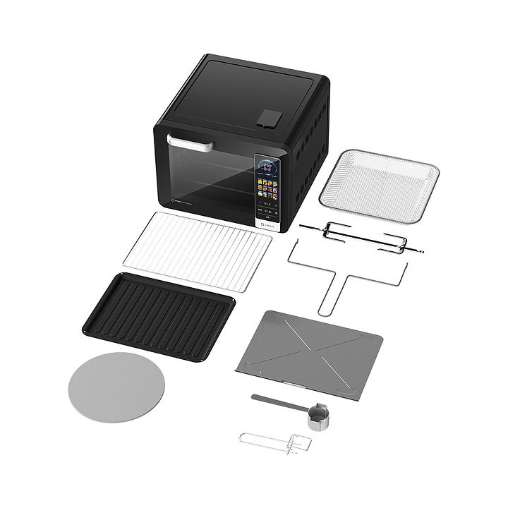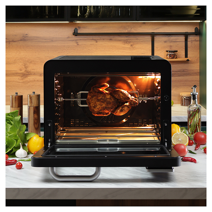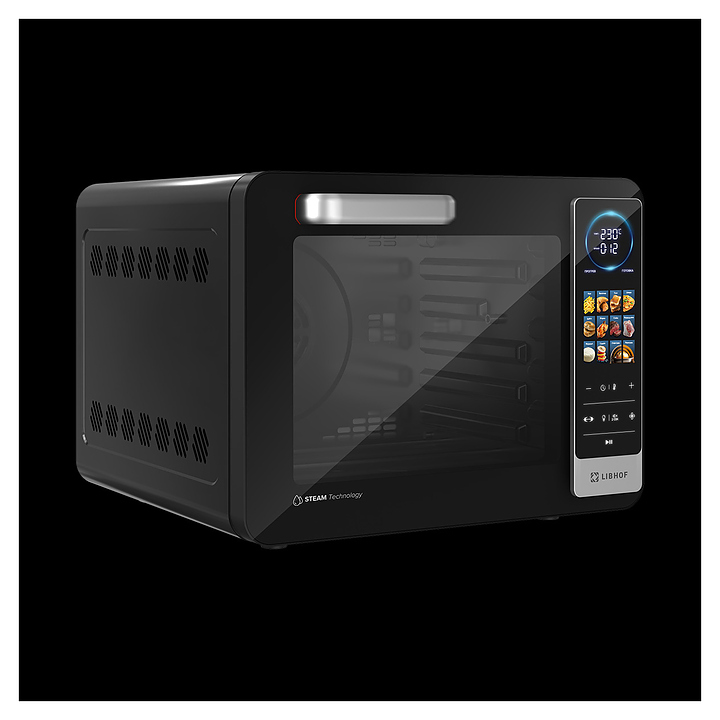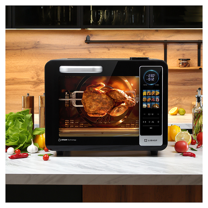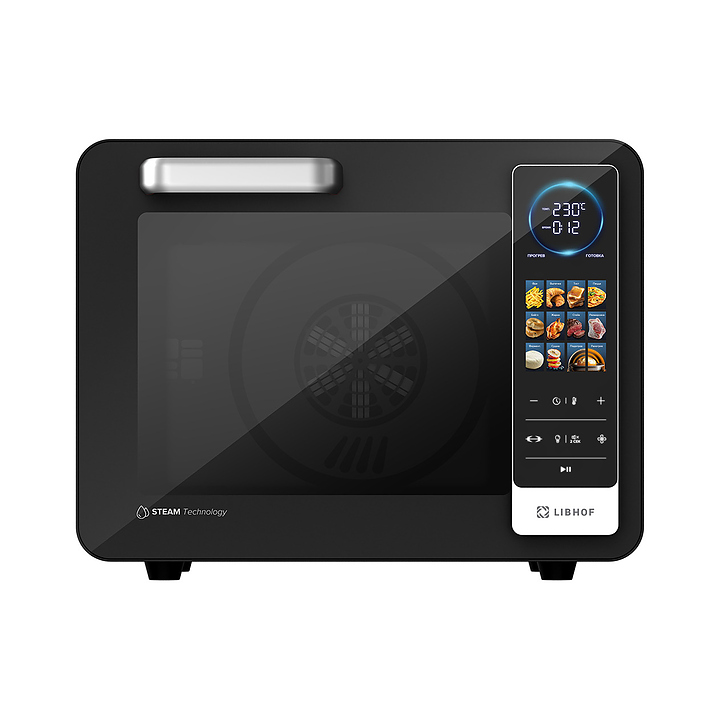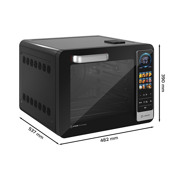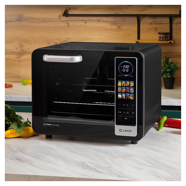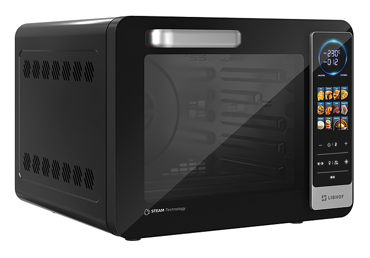 Электрический аэрогриль Libhof AFG-45s используется в домашних условиях для приготовления различных блюд с хрустящей корочкой без использования масла либо с добавлением небольшого его количества благодаря принудительной циркуляции горячего воздуха в камере. Модель оснащена трубчатым нагревательным элементом в верхней части, распашной дверцей, кабелем питания с вилкой, электронной панелью управления с сенсорными функциональными клавишами и цифровым дисплеем индикации. Корпус выполнен из ударопрочного пластика черного цвета, антипригарное тефлоновое покрытие. В комплект поставки входят аэрогриль, эмалированный противень, хромированная решетка, корзина для фритюра SUS 430, хромированная ручка для противня, поддон для крошек, набор для вертела, ложка, камень для пиццы, инструкция, книга рецептов. Особенности: