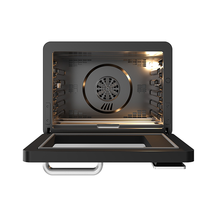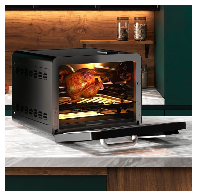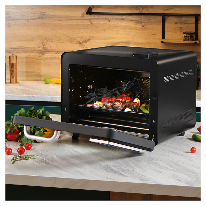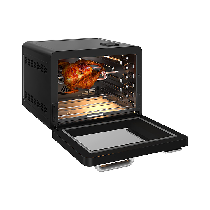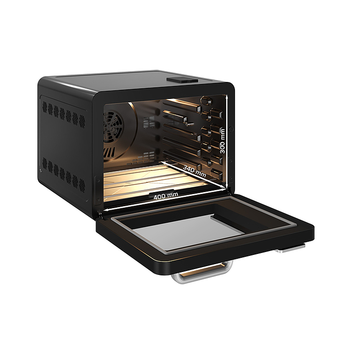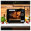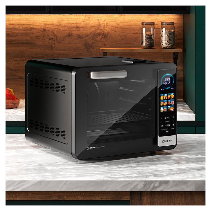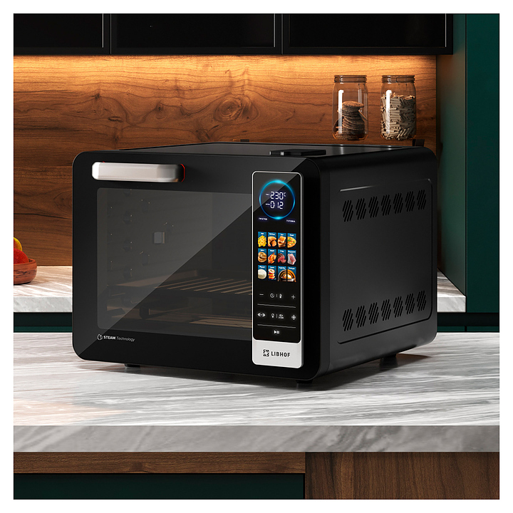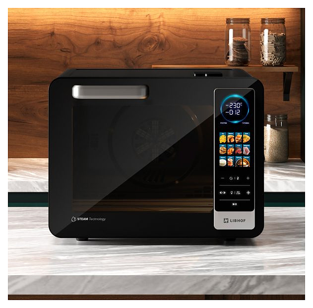 Электрический аэрогриль Libhof AFG-45s используется в домашних условиях для приготовления различных блюд с хрустящей корочкой без использования масла либо с добавлением небольшого его количества благодаря принудительной циркуляции горячего воздуха в камере. Модель оснащена трубчатым нагревательным элементом в верхней части, распашной дверцей, кабелем питания с вилкой, электронной панелью управления с сенсорными функциональными клавишами и цифровым дисплеем индикации. Корпус выполнен из ударопрочного пластика черного цвета, антипригарное тефлоновое покрытие. В комплект поставки входят аэрогриль, эмалированный противень, хромированная решетка, корзина для фритюра SUS 430, хромированная ручка для противня, поддон для крошек, набор для вертела, ложка, камень для пиццы, инструкция, книга рецептов. Особенности: