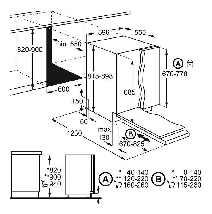 • Размеры ниши для встраивания: 820-900х600х550 мм