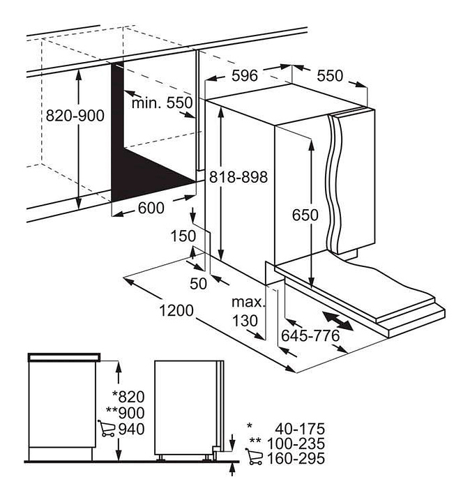• Размеры ниши для встраивания: 820-890х600х550 мм