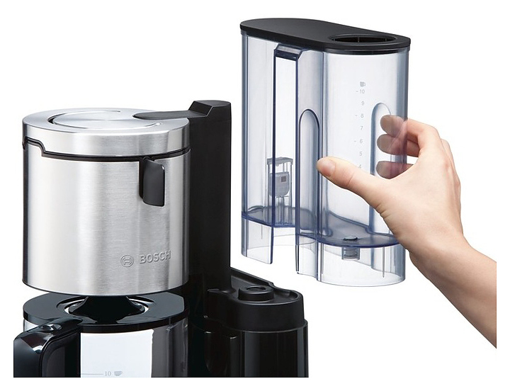 Кофеварка Bosch TKA8633 серии Styline используется в частных домах, квартирах, отелях и офисах для приготовления кофе. Модель оснащена панелью управления с кнопками, фильтром с ручкой и большим резервуаром для воды. Дополнительный поддон под подставкой для чашек защищает рабочую поверхность от пролива кофе. Плита автоподогрева сохраняет готовый напиток горячим в течение нескольких часов. Корпус выполнен из пластика, кофейник - из термостойкого стекла, декоративные элементы - из нержавеющей стали. В комплект поставки входят одноразовый фильтр, кофейник и прозрачный съемный контейнер для воды. Особенности: