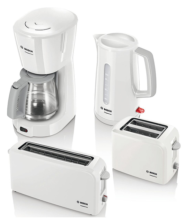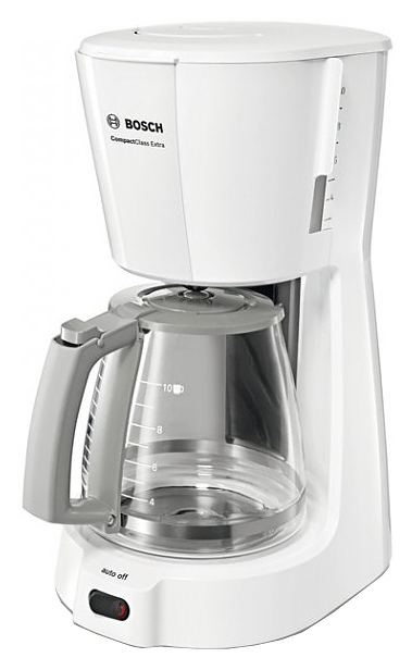 Кофеварка Bosch TKA3A031 серии CompactClass Extra используется в частных домах, квартирах, отелях и офисах для приготовления кофе. Модель оснащена кнопочным управлением, противокапельной системой при вынимании кувшина и съемным держателем фильтра. Платформа для подогрева сохраняет готовый напиток горячим в течение нескольких часов и может подогреть чашку для эспрессо. Корпус выполнен из пластика, контейнер для воды - из термостойкого стекла. В комплект поставки входят одноразовый фильтр, кофейник и прозрачный съемный контейнер для воды. Особенности: