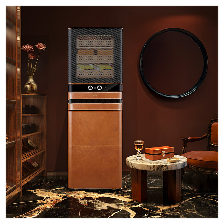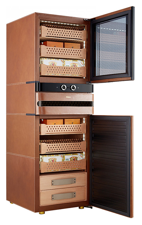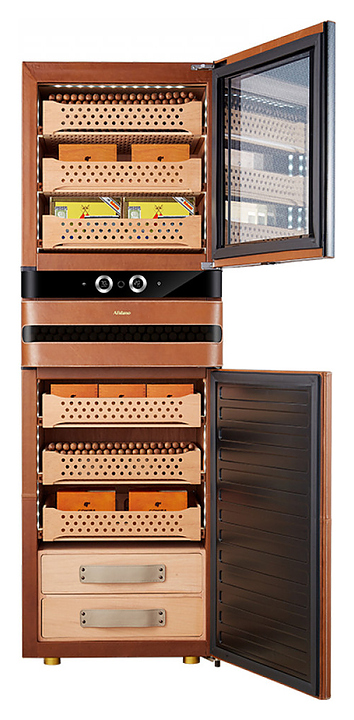 Шкаф Afidano L8 предназначен для хранения в оптимальных условиях и демонстрации сигар в специализированных магазинах, гостиницах, складских помещениях и домашних условиях. Модель оснащена 1 температурной зоной, 3 дверьми, 9 выдвижными ящиками, открытием отпечатком пальца, сенсорной панелью управления, утопленной ручкой, электронным термостатом и регулируемыми ножками. Цифровой гигрометр и внутренняя подсветка упрощают мониторинг и обзор содержимого. Корпус выполнен из стали, обшитой скульптурным полотном, внутренняя отделка и ящики - из испанского кедра. Особенности: