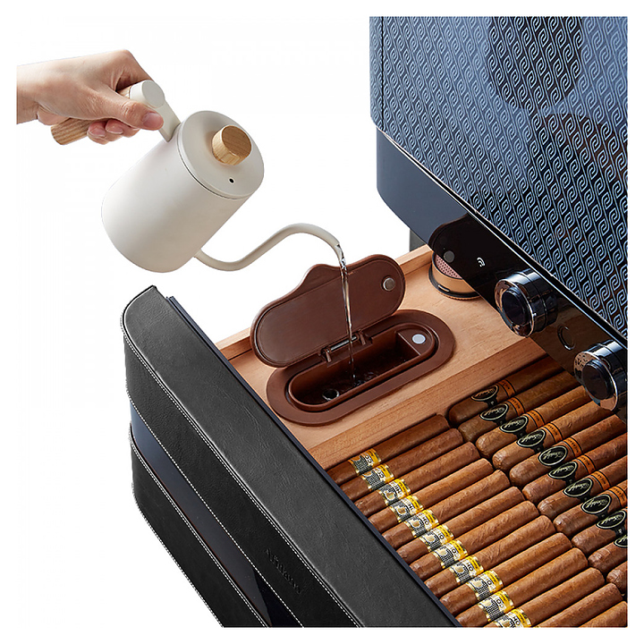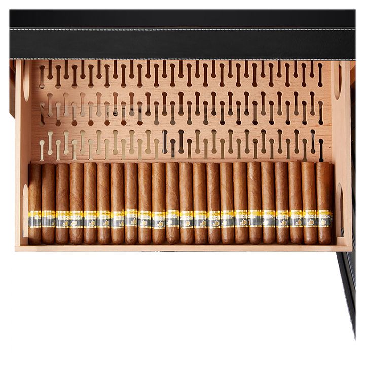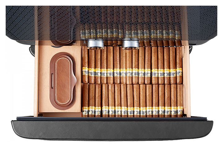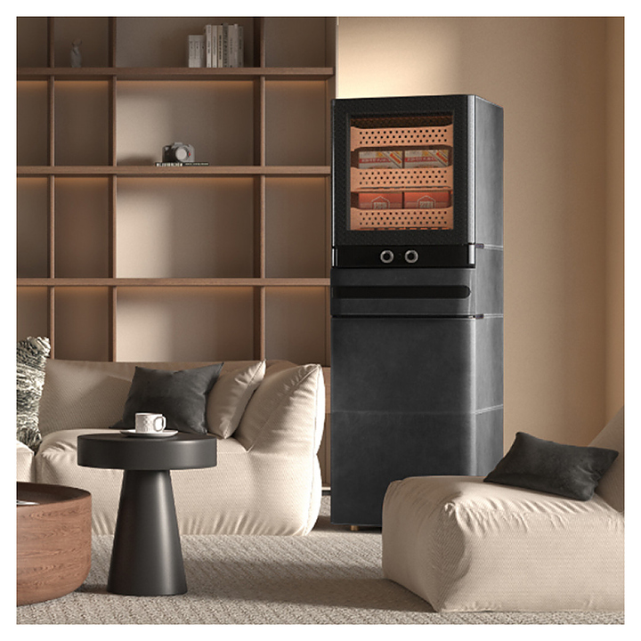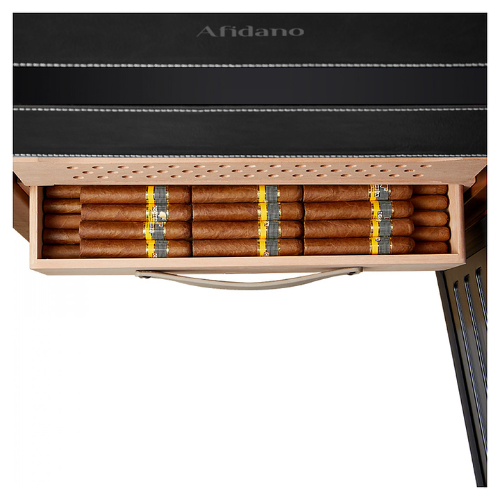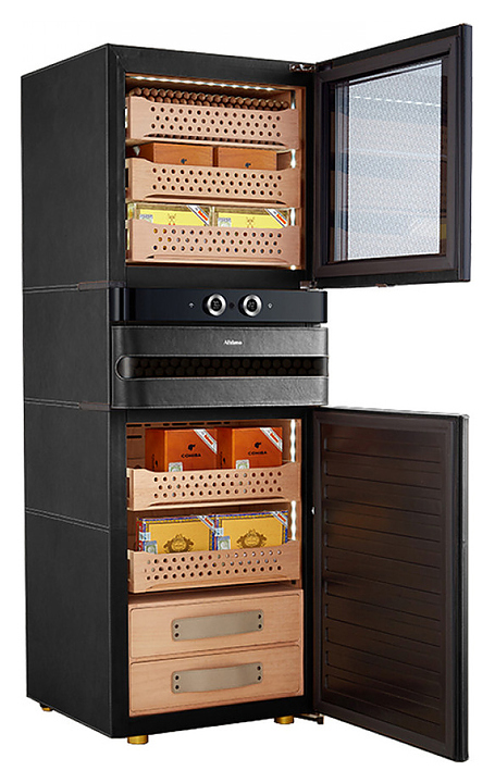 Шкаф Afidano L6 предназначен для хранения в оптимальных условиях и демонстрации сигар в специализированных магазинах, гостиницах, складских помещениях и домашних условиях. Модель оснащена 1 температурной зоной, 2 дверьми, 8 выдвижными ящиками, открытием отпечатком пальца, сенсорной панелью управления, утопленной ручкой, электронным термостатом и регулируемыми ножками. Цифровой гигрометр и внутренняя подсветка упрощают мониторинг и обзор содержимого. Корпус выполнен из стали, обшитой кожей, внутренняя отделка и ящики - из испанского кедра. Особенности: