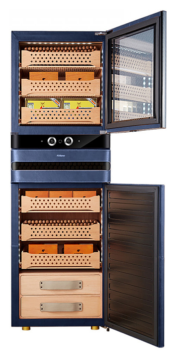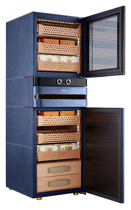 Шкаф Afidano L8 предназначен для хранения в оптимальных условиях и демонстрации сигар в специализированных магазинах, гостиницах, складских помещениях и домашних условиях. Модель оснащена 1 температурной зоной, 3 дверьми, 9 выдвижными ящиками, открытием отпечатком пальца, сенсорной панелью управления, утопленной ручкой, электронным термостатом и регулируемыми ножками. Цифровой гигрометр и внутренняя подсветка упрощают мониторинг и обзор содержимого. Корпус выполнен из стали, обшитой кожей, внутренняя отделка и ящики - из испанского кедра. Особенности: