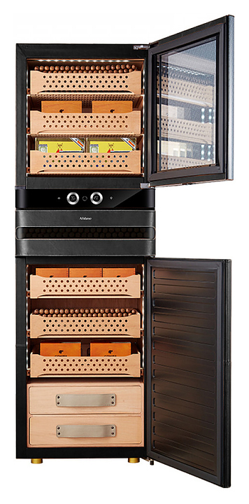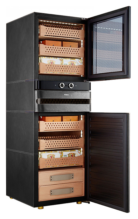 Шкаф Afidano L8 предназначен для хранения в оптимальных условиях и демонстрации сигар в специализированных магазинах, гостиницах, складских помещениях и домашних условиях. Модель оснащена 1 температурной зоной, 3 дверьми, 9 выдвижными ящиками, открытием отпечатком пальца, сенсорной панелью управления, утопленной ручкой, электронным термостатом и регулируемыми ножками. Цифровой гигрометр и внутренняя подсветка упрощают мониторинг и обзор содержимого. Корпус выполнен из стали, обшитой кожей, внутренняя отделка и ящики - из испанского кедра. Особенности: