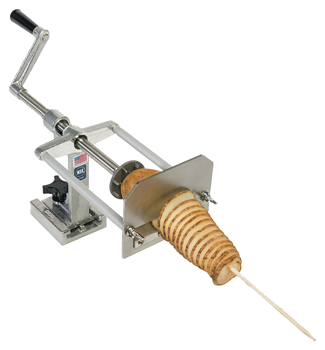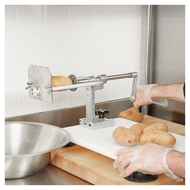 Картофелерезка Nemco 55050AN-CT предназначена для нарезки целого картофеля в кожуре на спиральные прямые чипсы (на палочке) на предприятиях общественного питания и торговли. Модель оснащена гладким валом и монтируется на любую плоскую поверхность. Принцип действия: установить чистый картофель и вращать ручку, одновременно равномерно надавливая для продвижения картофеля вперёд. Корпус выполнен из литого алюминия и нержавеющей стали. В комплект поставки входит отрезающий нож, который при необходимости заменяется новым (приобретается отдельно). Особенности: