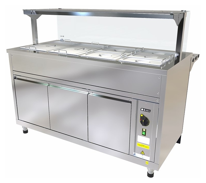 Прилавок-мармит Abat ЭМК-70Е-01 используется в составе линии раздачи Сэйла для кратковременного хранения в горячем состоянии вторых блюд в функциональных емкостях и раздачи их потребителю на предприятиях общественного питания и торговли. Модель оснащена ванной, полкой и подсветкой. Фасад выполнен из МДФ, съемный защитный экран - из ударопрочного закаленного стекла. Направляющие с установленными заглушками, 2 гастроемкости GN 1/1*150, 2 гастроемкости GN 1/2*150 и 3 гастроемкости GN 1/3*150 входят в комплект поставки, передние фасады приобретаются по отдельному заказу. Особенности: