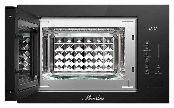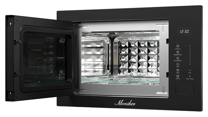 Встраиваемая микроволновая печь Monsher MMH 1025 Noir предназначена для приготовления пищи, подогрева готовых блюд и ингридиентов, а также размораживания полуфабрикатов на предприятиях общественного питания и в домашних условиях. Модель оснащена магнетроном, кварцевым грилем, кабелем питания с вилкой, камерой с распашной дверью со смотровым окном, расположенной в правой части фронта электронной панелью управления с сенсорными функциональными клавишами и цифровым дисплеем с белой подсветкой индикации. Корпус выполнен из высококачественной стали, фронтальные панели черного цвета с полным остеклением без винтового крепежа, внутренняя облицовка камеры – из нержавеющей стали, тарелка – из ударопрочного стекла. Комплектация: