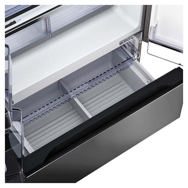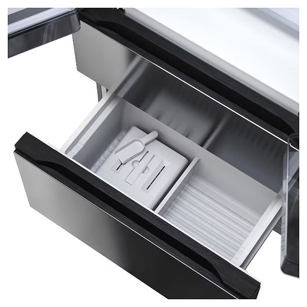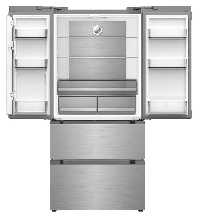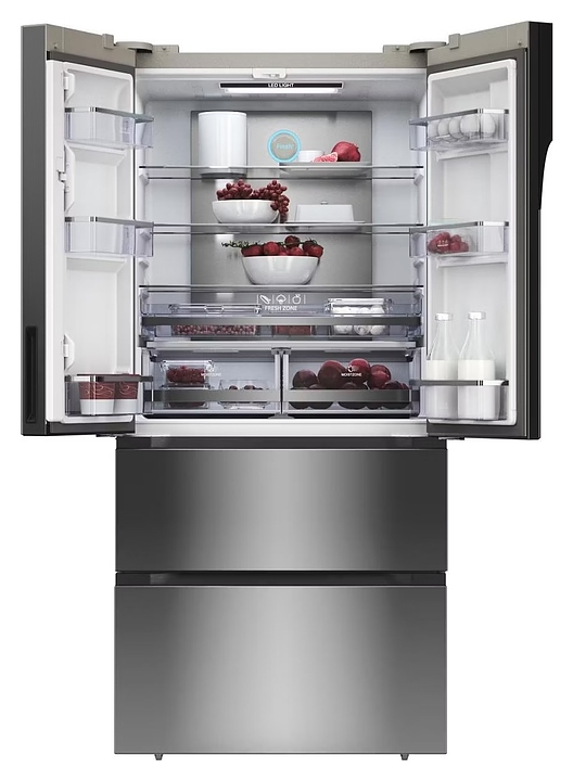 Холодильник Kuppersberg RFFI 184 X типа Side- by-Side предназначен для охлаждения, замораживания, кратковременного и длительного хранения пищевых продуктов и напитков в гостиничных комплексах, офисах, а также домашних условиях. Модель оснащена холодильной камерой сверху с 2 распашными дверьми, морозильной камерой снизу с 2 выдвижными секциями типа French Door, кабелем питания с евровилкой, расположенной в верхней части фасада электронной панелью управления с сенсорными функциональными клавишами, дисплеем с цифровыми и символьными сегментами индикации с белой подсветкой. Фасады дверей выполнены из нержавеющей стали с сатинированной поверхностью, внутренняя облицовка камер – из антибактериального пластика белого цвета, задняя стенка холодильной камеры с металлической панелью, плоские полки – из прозрачного закаленного стекла, ящики – из белого пластика с прозрачным фронтом, навесные полки – из прозрачного пластика, ящики и полки декорированы фронтальными металлическими окантовками серебристого оттенка, упаковка – из гофрокартона, полимерной пленки и полистирола.