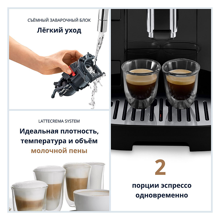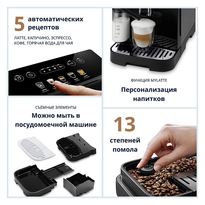 Кофемашина автоматическая De'Longhi Magnifica Evo ECAM 290.61.B предназначена для приготовления молотого кофе и напитков на его основе в гостиницах, офисах и домашних условиях. Модель оснащена функцией My Coffee, которая позволяет программировать настройки для различных напитков, возможность использования фильтра для воды и системы Latte Crema, которая обеспечивает идеальную консистенцию пены, а также помпой мощностью 15 бар. Корпус выполнен из нержавеющего металла. Комплектация: