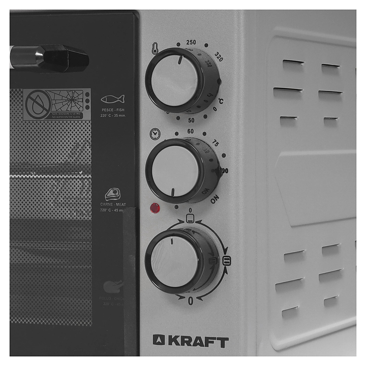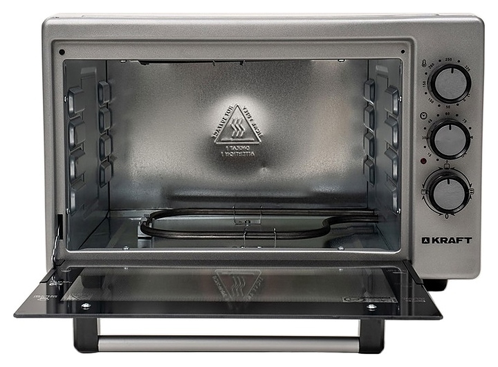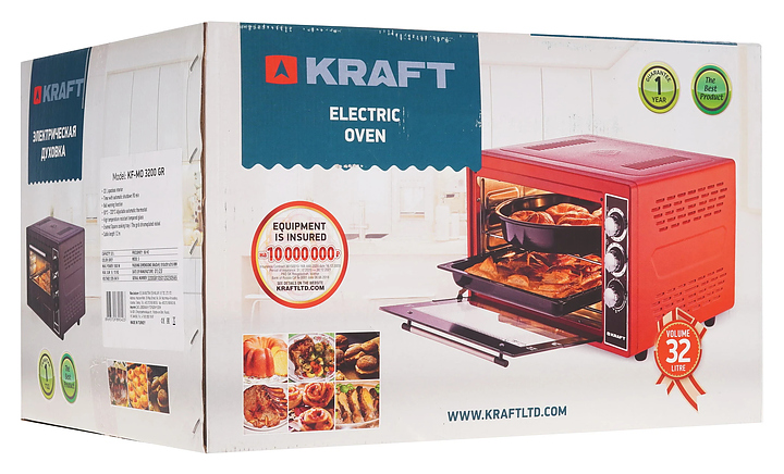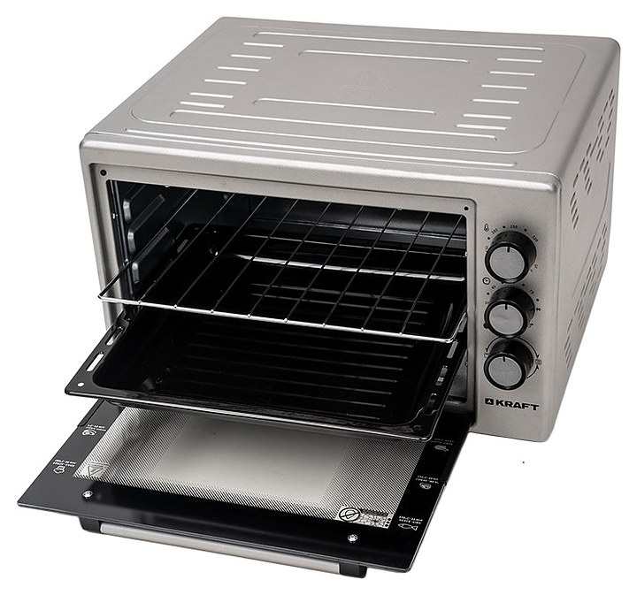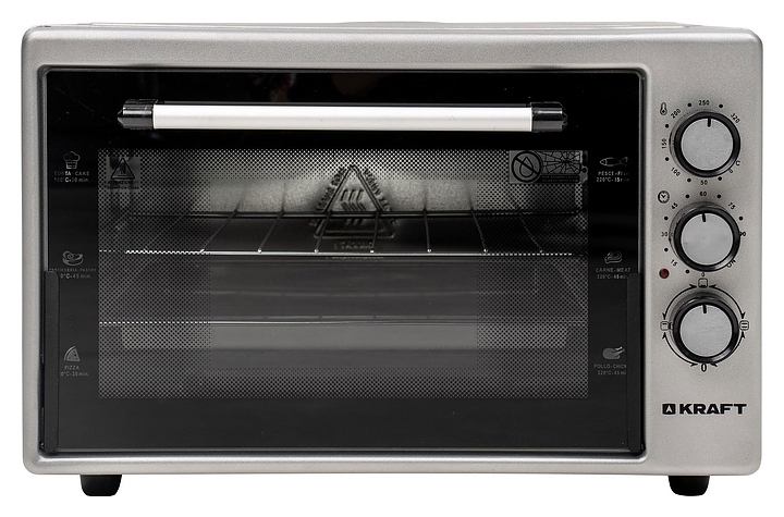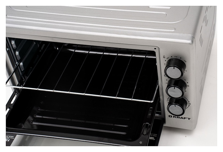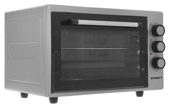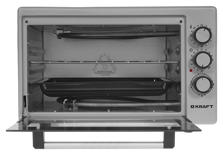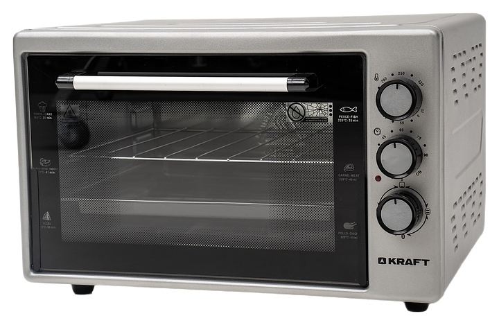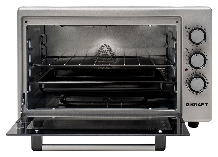 Настольная электрическая мини-печь Kraft KF-MO 3200 GR предназначена для приготовления горячих сэндвичей и других блюд, выпекания хлебобулочных и кондитерских изделий, подогрева готовых блюд и ингредиентов, размораживания полуфабрикатов, а также сушки фруктов и овощей в гостиницах, офисах и домашних условиях. Модель оснащена жарочной камерой с верхним и нижним трубчатыми нагревательными элементами, 3 уровнями интегрированных в боковые стенки направляющих для противней, откидной дверью со смотровым окном и горизонтальной рукояткой, кабелем питания с вилкой, термостатом и расположенной с правой стороны фасада электромеханической панелью управления с 3 поворотными переключателями. Корпус выполнен из стали с антикоррозийным покрытием серого цвета, дверь – из прозрачного жаропрочного закаленного стекла с черной рамкой по периметру, фурнитура с поверхностью в комбинации черного и серебристого тонов, противень – из стали с эмалированным покрытием, решетка – из стали c хромникелевым покрытием. Комплектация: