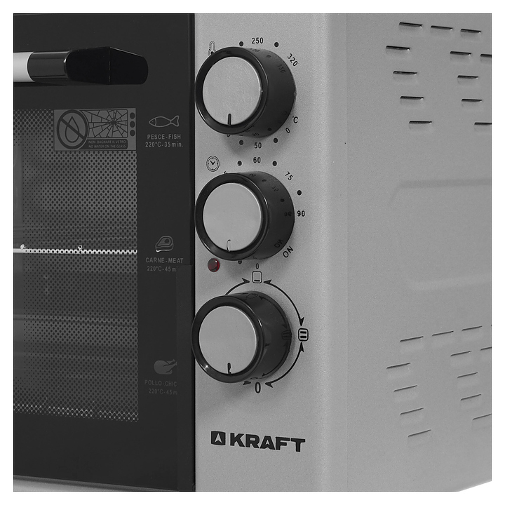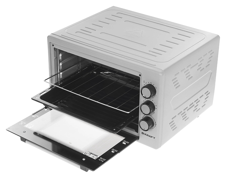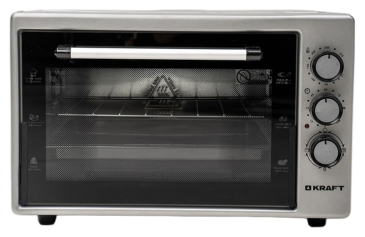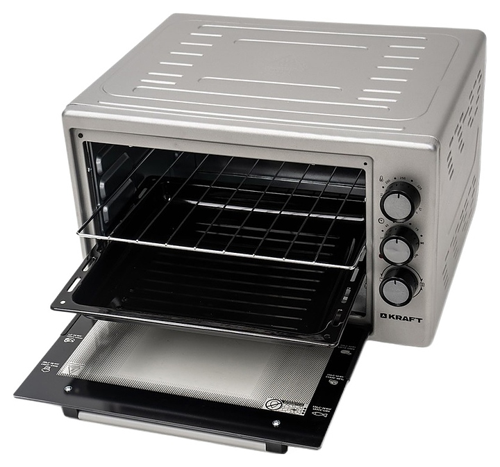 Настольная электрическая мини-печь Kraft KF-MO 3800 GR предназначена для приготовления горячих сэндвичей и других блюд, выпекания хлебобулочных и кондитерских изделий, подогрева готовых блюд и ингредиентов, размораживания полуфабрикатов, а также сушки фруктов и овощей в гостиницах, офисах и домашних условиях. Модель оснащена жарочной камерой с верхним и нижним трубчатыми нагревательными элементами, 3 уровнями интегрированных в боковые стенки направляющих для противней, откидной дверью со смотровым окном и горизонтальной рукояткой, кабелем питания с вилкой, термостатом и расположенной с правой стороны фасада электромеханической панелью управления с 3 поворотными переключателями. Корпус выполнен из стали с антикоррозийным покрытием серого цвета, дверь – из прозрачного жаропрочного закаленного стекла с черной рамкой по периметру, фурнитура с поверхностью в комбинации черного и серебристого тонов, противень – из стали с эмалированным покрытием, решетка – из стали c хромникелевым покрытием. Комплектация: