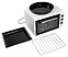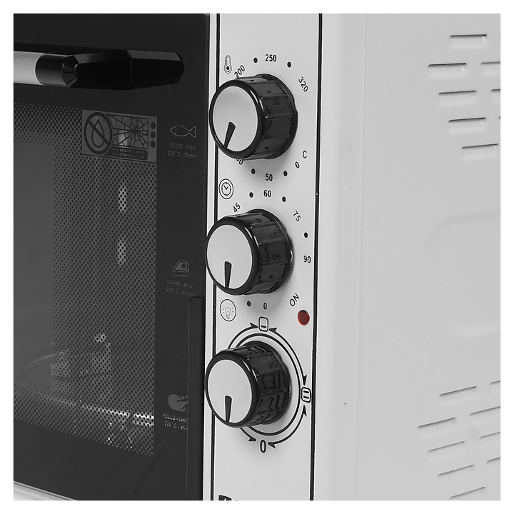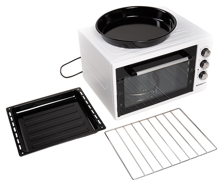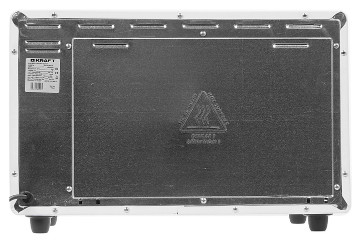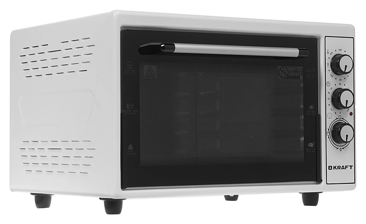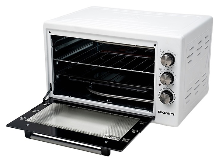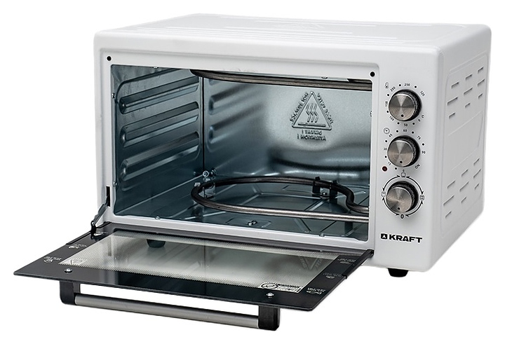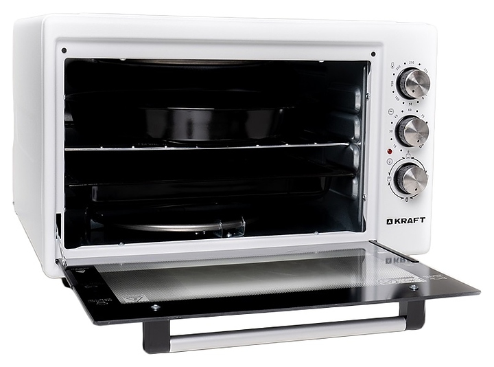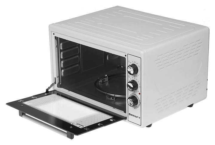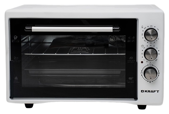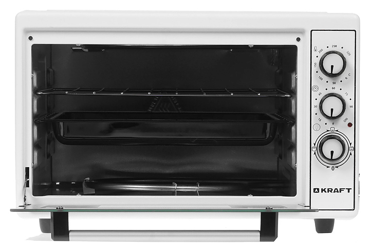 Настольная электрическая мини-печь Kraft KF-MO 3801 W предназначена для приготовления горячих сэндвичей и других блюд, выпекания хлебобулочных и кондитерских изделий, подогрева готовых блюд и ингредиентов, размораживания полуфабрикатов, а также сушки фруктов и овощей в гостиницах, офисах и домашних условиях. Модель оснащена жарочной камерой с верхним и нижним трубчатыми нагревательными элементами, 3 уровнями интегрированных в боковые стенки направляющих для противней, откидной дверью со смотровым окном и горизонтальной рукояткой, кабелем питания с вилкой, термостатом и расположенной с правой стороны фасада электромеханической панелью управления с 3 поворотными переключателями. Корпус выполнен из стали с антикоррозийным покрытием белого цвета, дверь – из прозрачного жаропрочного закаленного стекла с черной рамкой по периметру, фурнитура с поверхностью в комбинации черного и серебристого тонов, противни – из стали с эмалированным покрытием, решетка – из стали c хромникелевым покрытием. Комплектация: