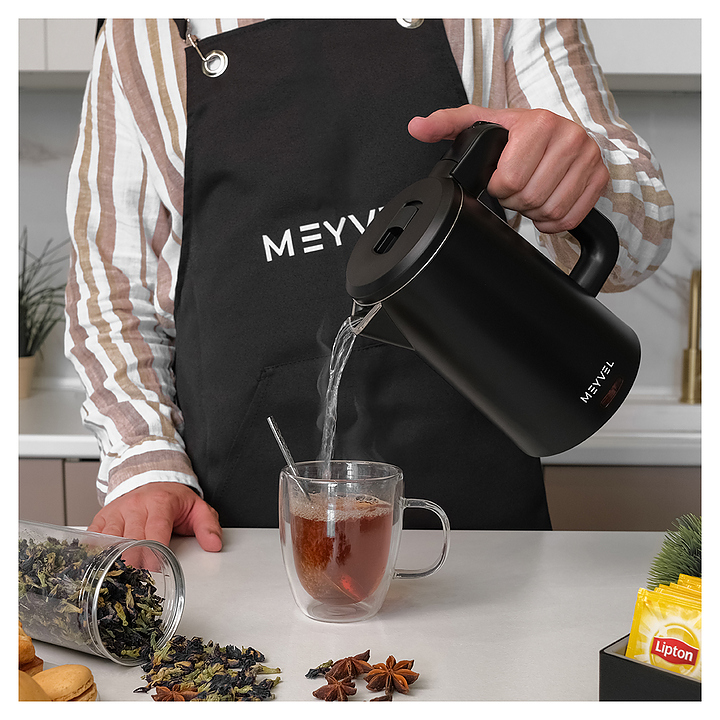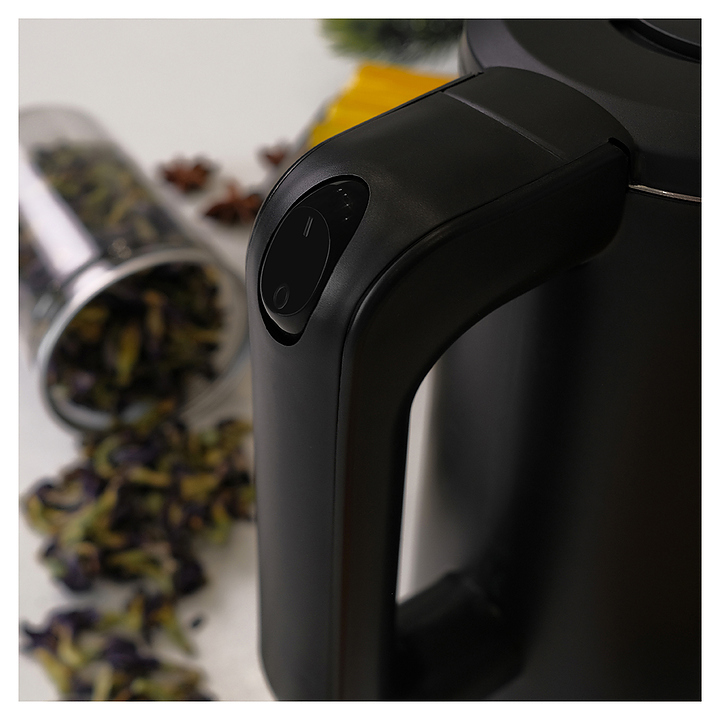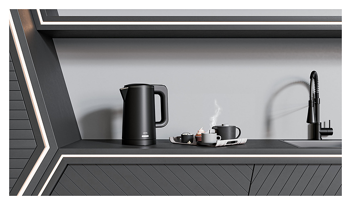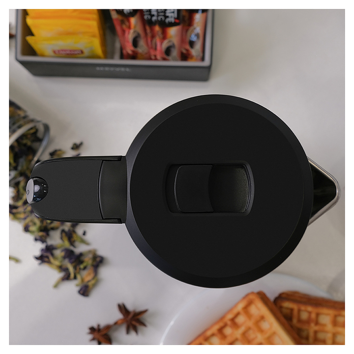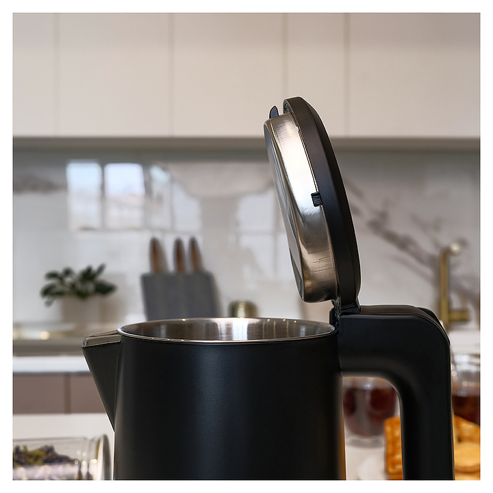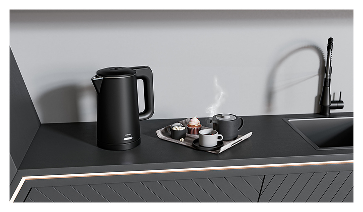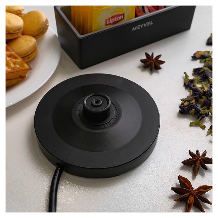 Электрический чайник MEYVEL MKE-03T (Black) предназначен для подогрева воды и приготовления горячих напитков в гостиницах, офисах и домашних условиях. Модель оснащена круглой подставкой, термостатом марки Jiatai, кабелем питания с вилкой, откидной уплощенной крышкой, интегрированным в кромку емкости антикапельным изливом и дугообразной рукояткой. Подставка, внешняя облицовка корпуса и крышки выполнены из пластика с черной поверхностью и матовым олеофобным покрытием для защиты от отпечатков пальцев, бесшовная колба и внутренняя облицовка крышки – из высококачественной безопасной для пищевой продукции нержавеющей стали марки SUS304, упаковка – из целлофана, пенопласта и гофрокартона. Особенности: