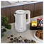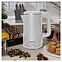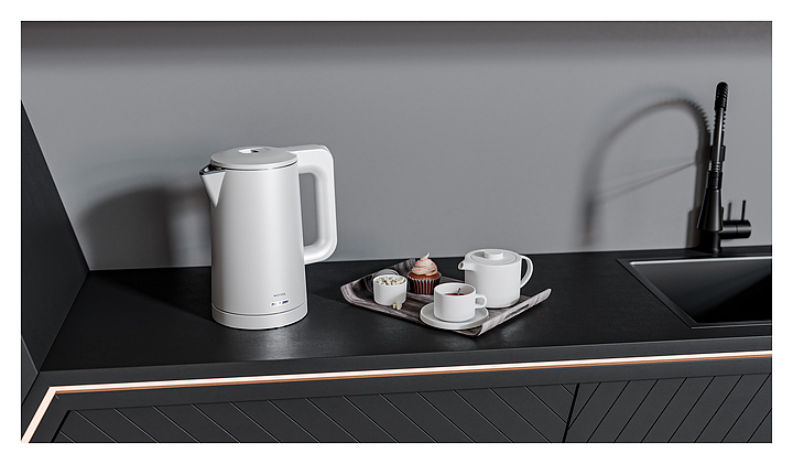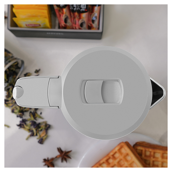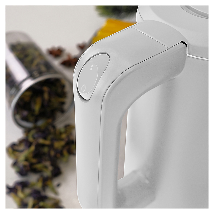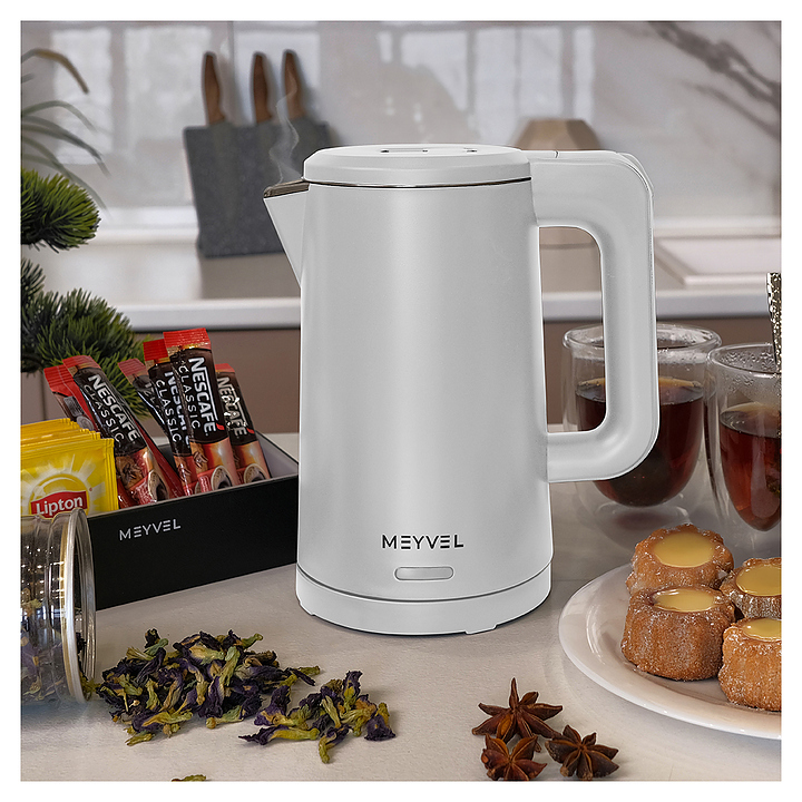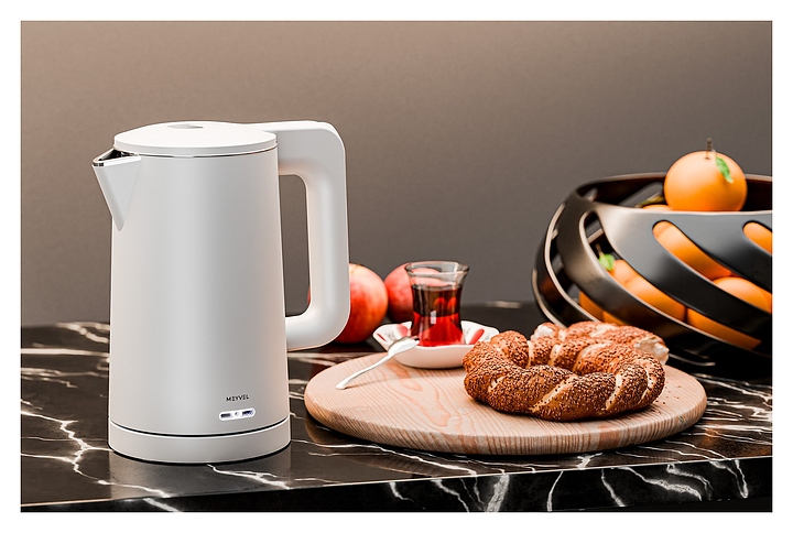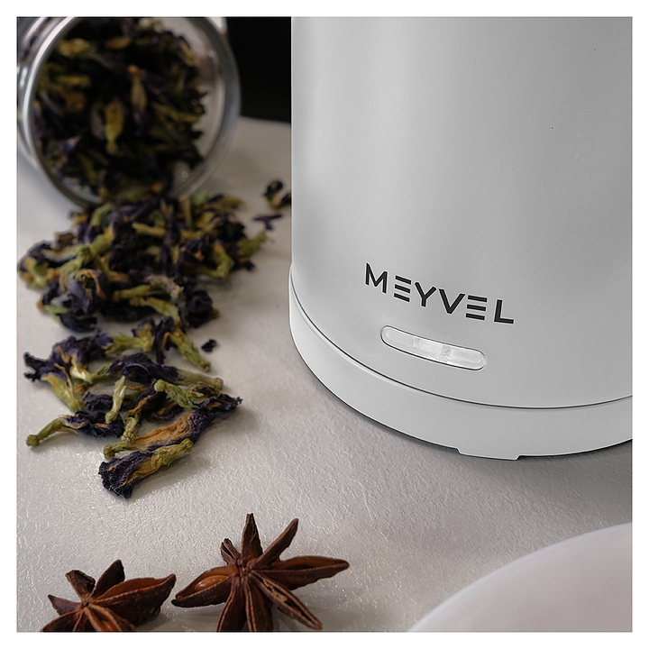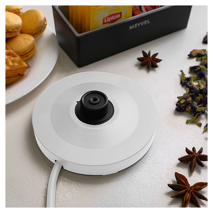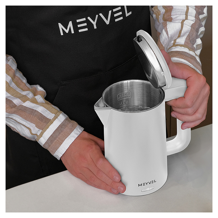 Электрический чайник MEYVEL MKE-03T (White) предназначен для подогрева воды и приготовления горячих напитков в гостиницах, офисах и домашних условиях. Модель оснащена круглой подставкой, термостатом марки Jiatai, кабелем питания с вилкой, откидной уплощенной крышкой, интегрированным в кромку емкости антикапельным изливом и дугообразной рукояткой. Подставка, внешняя облицовка корпуса и крышки выполнены из пластика с белой поверхностью и матовым олеофобным покрытием для защиты от отпечатков пальцев, бесшовная колба и внутренняя облицовка крышки – из высококачественной безопасной для пищевой продукции нержавеющей стали марки SUS304, упаковка – из целлофана, пенопласта и гофрокартона. Особенности: