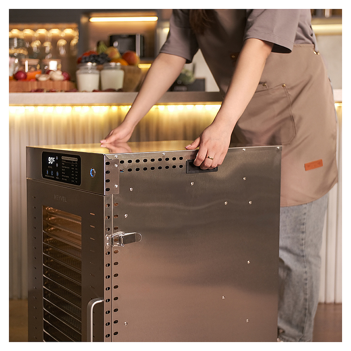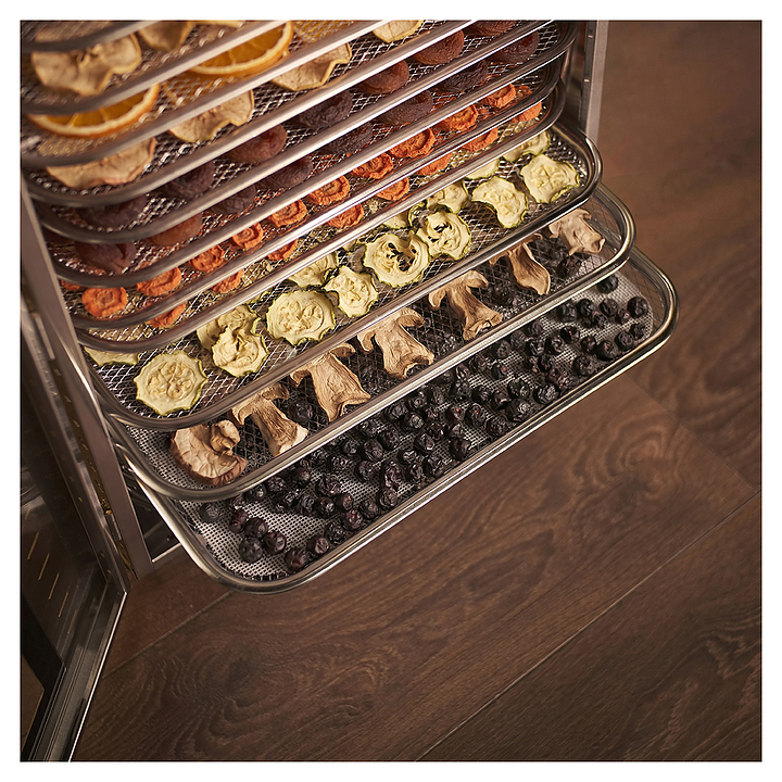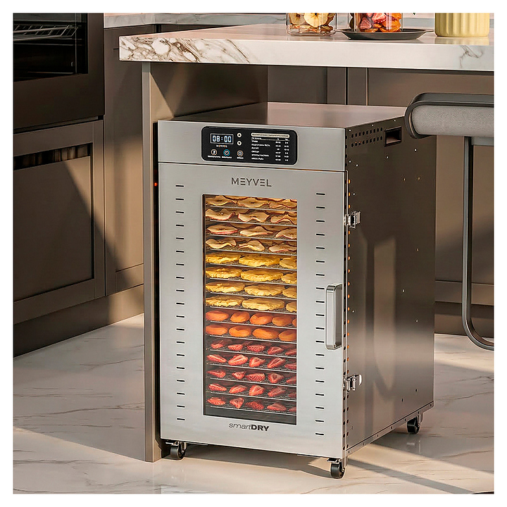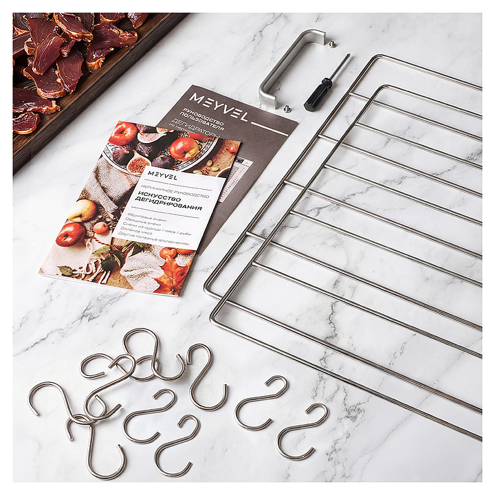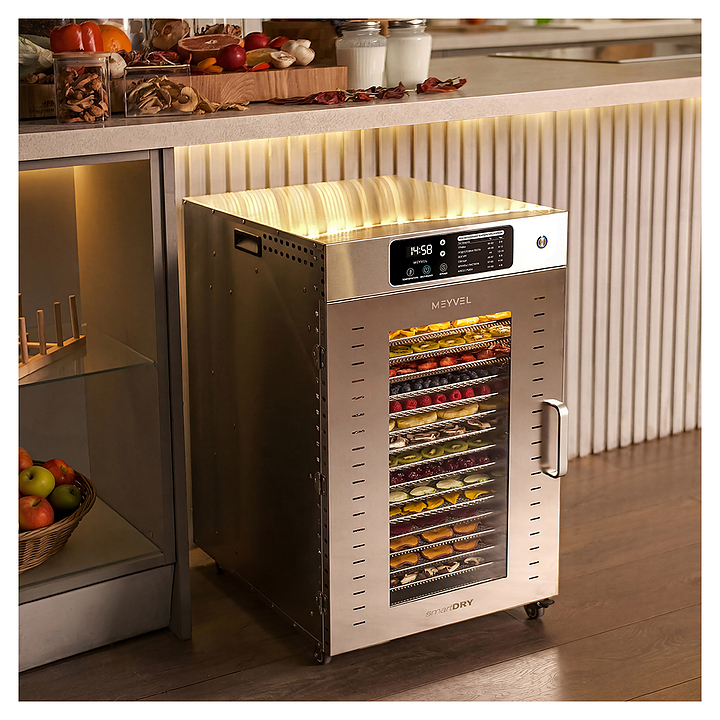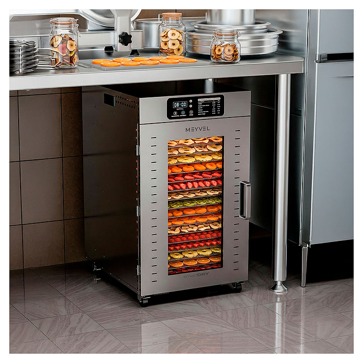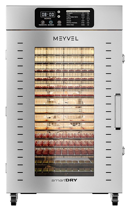 Электрический дегидратор MEYVEL MDH18-1S (Inox) используется для сушки овощей, фруктов, ягод, грибов и трав, а также вяления рыбы и мяса, расстойки теста, приготовления сухариков, пастилы и йогурта в домашних условиях. Модель оснащена камерой с 18 уровнями направляющих для размещения поддонов, расположенными в задней стенке 3 вентиляторами и нагревательными элементами, левосторонней распашной дверью с вертикальной рукояткой, обзорным остеклением, кабелем питания с вилкой, расположенным на верхней фронтальной панели электронным блоком управления с сенсорной клавиатурой и светодиодным цифровым дисплеем. Корпус и решетчатые поддоны выполнены из высококачественной нержавеющей стали марки SS304 с серебристой поверхностью, поддоны для пастилы и мелкоячеистые сетки – из силикона. Комплектация: