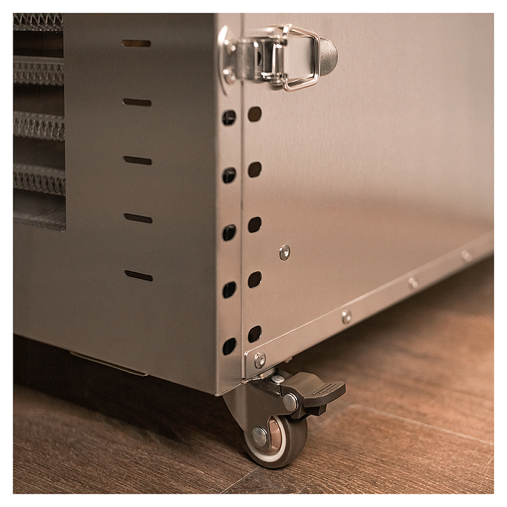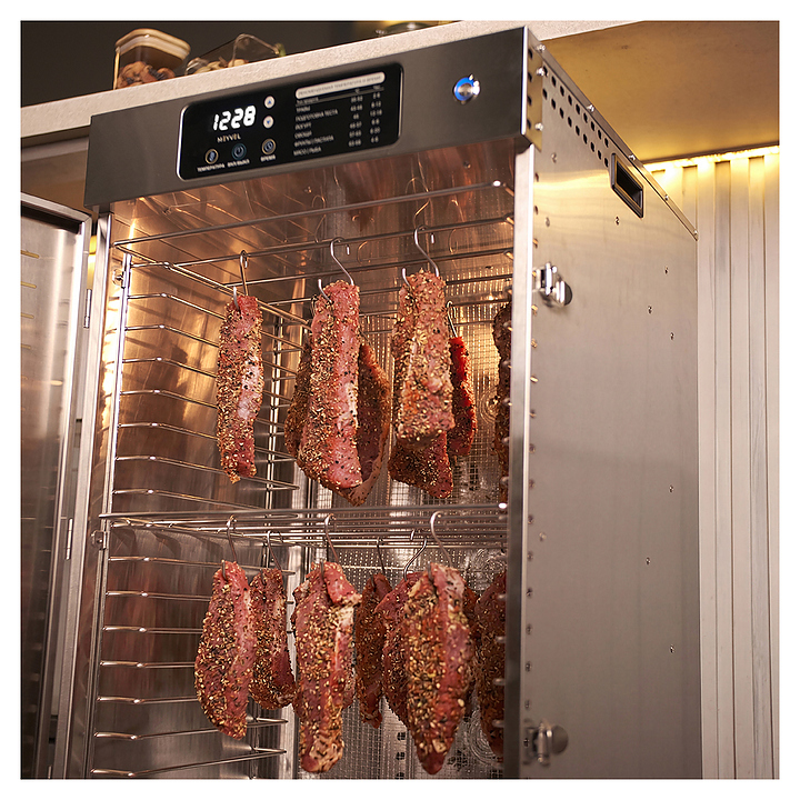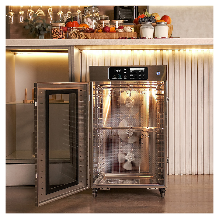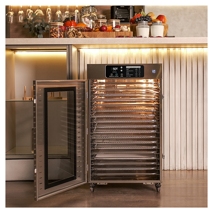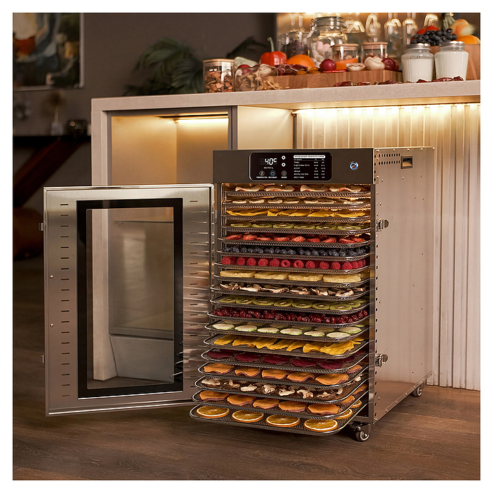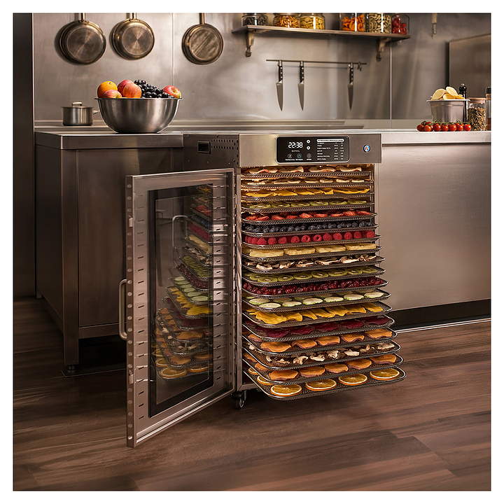 Электрический дегидратор MEYVEL MDH18-1S (Inox) используется для сушки овощей, фруктов, ягод, грибов и трав, а также вяления рыбы и мяса, расстойки теста, приготовления сухариков, пастилы и йогурта в домашних условиях. Модель оснащена камерой с 18 уровнями направляющих для размещения поддонов, расположенными в задней стенке 3 вентиляторами и нагревательными элементами, левосторонней распашной дверью с вертикальной рукояткой, обзорным остеклением, кабелем питания с вилкой, расположенным на верхней фронтальной панели электронным блоком управления с сенсорной клавиатурой и светодиодным цифровым дисплеем. Корпус и решетчатые поддоны выполнены из высококачественной нержавеющей стали марки SS304 с серебристой поверхностью, поддоны для пастилы и мелкоячеистые сетки – из силикона. Комплектация:
