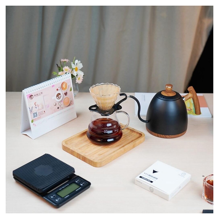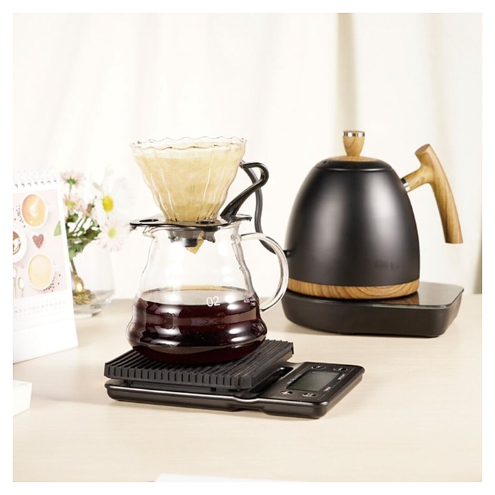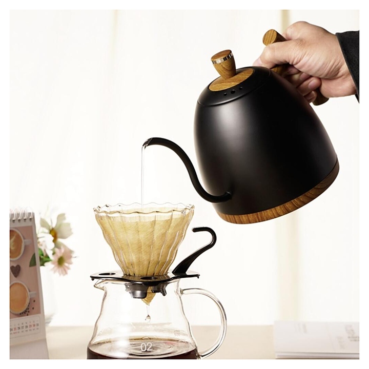 Электрический чайник P.L. Barbossa S0362-BLACK предназначен для заваривания кофе методом пуровер, а также чая в кофейнях, барах, отелях, офисах и домашних условиях. Модель состоит из емкости и подставки, емкость оснащена плавно зауженным кверху бортом, тонким изящным носиком, Г-образной рукояткой, крышкой с ручкой и паровыми отверстиями, подставка – кабелем питания с вилкой и сенсорной панелью управления. Емкость и крышка выполнены из нержавеющей стали марки 304 с черным матовым покрытием, рукоятки и основание емкости – из термостойкого пластика с поверхностью под светлое дерево, подствка – из черного пластика. Особенности: