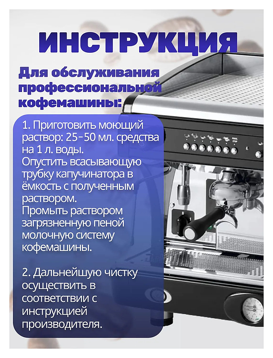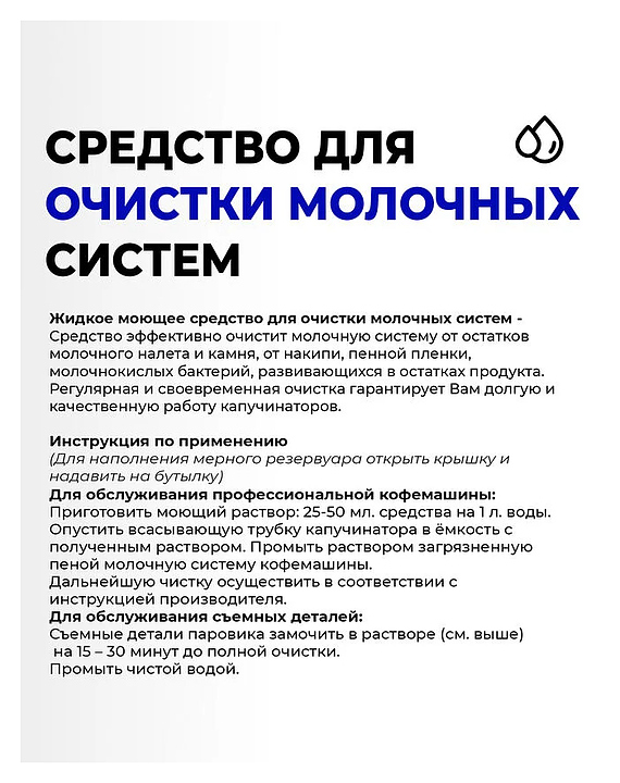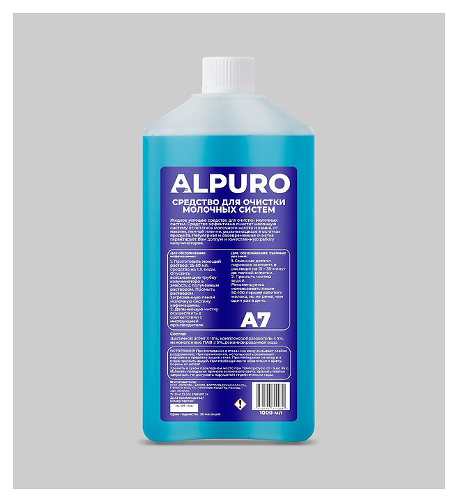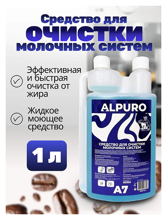 Жидкое моющее средство для очистки молочных систем ALPURO A7 предназначено для использования в барах, кафе, ресторанах и других предприятиях общественного питания и торговли, а также в домашних условиях. Средство эффективно очистит молочную систему от остатков молочного налета и камня, от накипи, пенной пленки, молочнокислых бактерий, развивающихся в остатках продукта. Регулярная и своевременная очистка гарантирует Вам долгую и качественную работу капучинаторов. Инструкция по применению:
