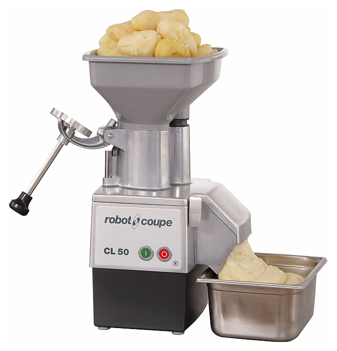 Овощерезка Robot Coupe CL50 используется на предприятиях общественного питания и торговли для нарезки овощей, фруктов, грибов, твердого сыра и колбас и дальнейшего использования их в качестве ингредиентов для приготовления супов, салатов, гарниров и пр. Модель оснащена 2 загрузочными отверстиями: большой D-образной воронкой для нарезки объёмных овощей (вмещает до 10 помидоров) и круглой - для длинных и нежных. В комплект поставки входит полукруглая воронка 2,2 л, цилиндрическая воронка Ø 58 мм и Ø 39 мм, толкатель Exactitub, аксессуар для безопасной и бережной очистки решеток D-Clean Kit и протирка для картофельного пюре 28189 2 мм или 28207 3 мм. Модель протирки уточняйте у наших менеджеров. Конструкция протирки:
