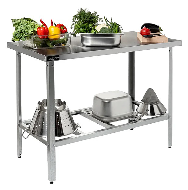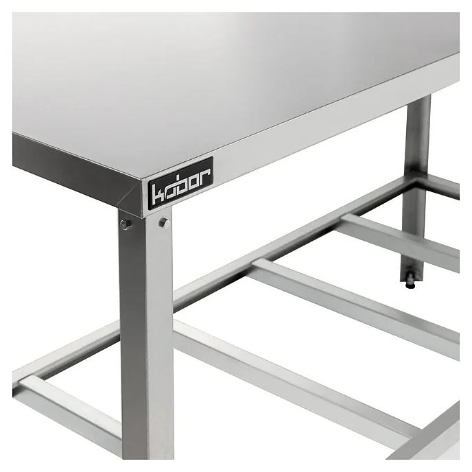 Столешница стола Kобор СР-80/60 произведена из высококачественной нержавеющей стали, а также для увеличения прочности и во избежании прогибания укреплена ЛДСП толщиной 16 мм. Ножки стола регулируются по высоте, что помогает избежать наклона рабочей поверхности стола. Каркас стола выполнен из оцинкованного уголка. Товар поставляется в разобранном виде и в упаковке для облегчения транспортировки.