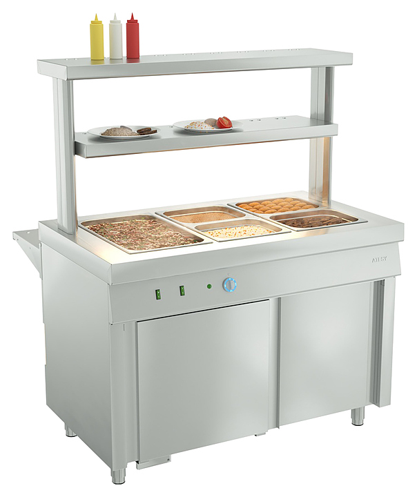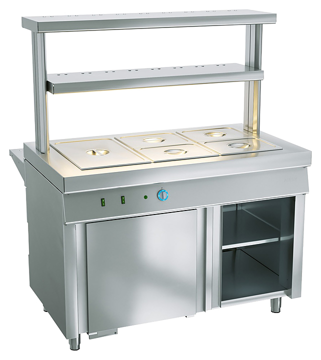 Мармит ATESY Ривьера используется в составе линий раздач на предприятиях общественного питания и торговли для кратковременного хранения в горячем состоянии вторых блюд. Модель оснащена электронагревателями для каждой гастроемкости, регулируемыми по высоте ножками, полкой, нейтральным шкафом и дверью-купе в нижней части со стороны обслуживающего персонала. В комплект поставки входят 2 секционные перемычки для установки гастроемкостей других размеров. Особенности: