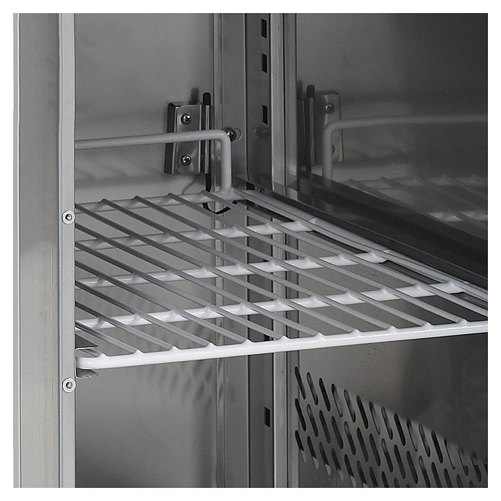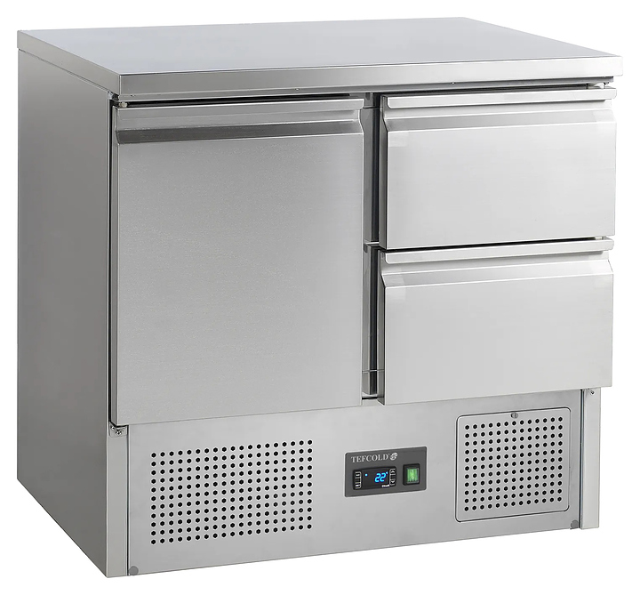 Холодильный стол TEFCOLD SA912 предназначен для обработки ингредиентов, используемых для приготовления салатов, охлаждения и кратковременного хранения скоропортящихся продуктов и напитков на предприятиях общественного питания и торговли. Прибор оснащен компрессором, градусником, 2 ящиками GN 1/1, полкой GN 1/1 и регулируемыми ножками. Корпус и внутренняя отделка выполнены из нержавеющей стали. Особенности: