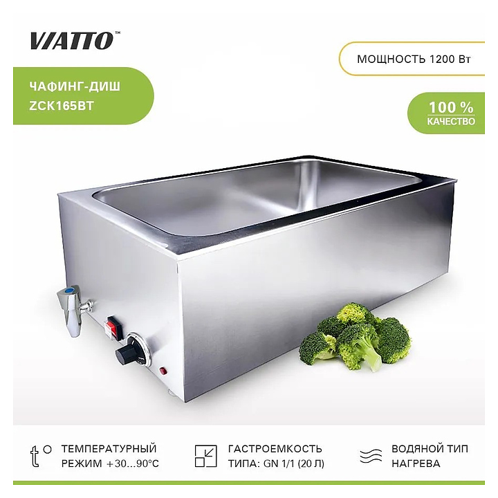 Мармит VIATTO ZCK165BT предназначен для поддержания в горячем состоянии вторых блюд, гарниров и соусов на предприятиях общественного питания. Модель оснащена терморегулятором. Подогрев на водяном пару обеспечивает равномерный нагрев емкостей без пересушивания и пригорания подогреваемых блюд. Корпус выполнен из нержавеющей стали. Гастроемкость в комплект не входит. Дополнительные характеристики: