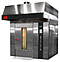 Верхний привод вращения стеллажной тележки, низкий порог пекарной камеры, короткий пандус, верхний узел фиксации тележки позволяют избежать встряски тестовых заготовок при закатывании стеллажной тележки, исключают ее смещение во время выпечки