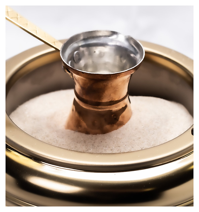 Кофе на песке JOHNY AK/8-5 используется в специализированных кофейных заведениях для приготовления кофе по-восточному (на песке). В наполненную нагретым до нужной температуры песком платформу устанавливается джезва с водой и перемолотым кофе. Равномерный прогрев, обеспечиваемый нагревательным элементом из алюминия, и медленное томление придают напитку натуральный яркий вкус и насыщенный аромат. В комплект поставки входят песок и 1 турка на 70 мл. Особенности: