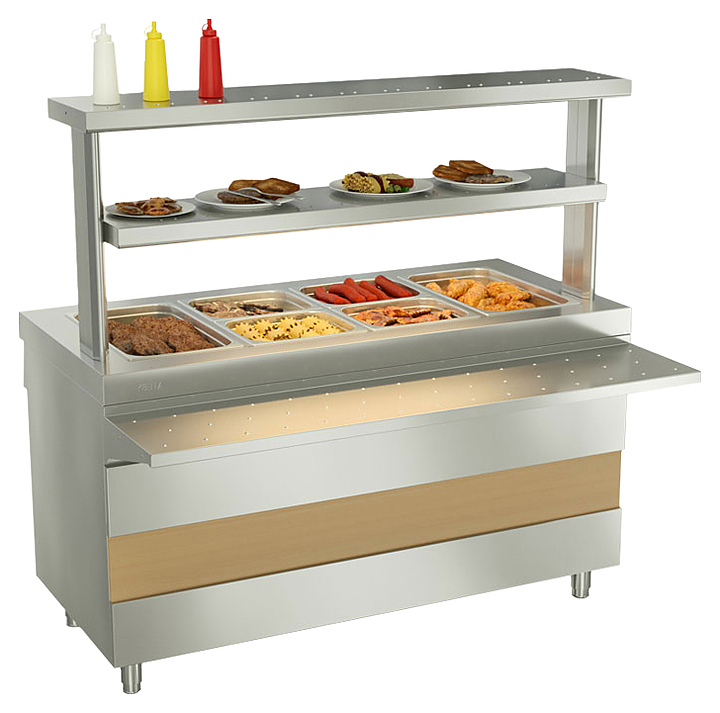 Мармит ATESY Ривьера используется в составе линий раздач на предприятиях общественного питания и торговли для кратковременного хранения в горячем состоянии вторых блюд. Модель оснащена паровым нагревателем, регулируемыми по высоте ножками, полкой, нейтральным шкафом и дверью-купе в нижней части мармита со стороны обслуживающего персонала. В комплект поставки входят 3 секционные перемычки для установки гастроемкостей других размеров. Особенности: