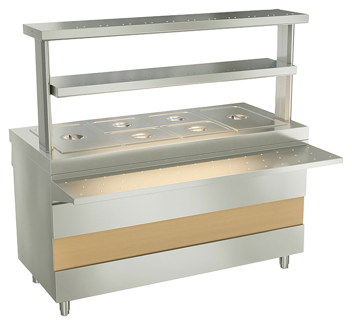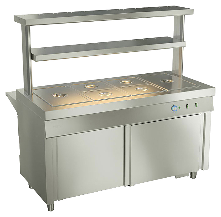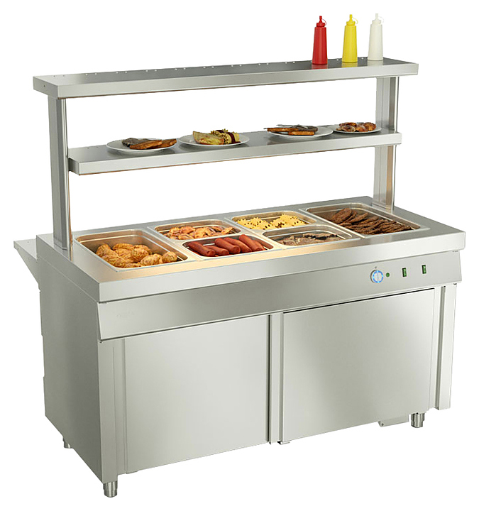 Мармит ATESY Ривьера используется в составе линий раздач на предприятиях общественного питания и торговли для кратковременного хранения в горячем состоянии вторых блюд. Модель оснащена электронагревателями для каждой гастроемкости, регулируемыми по высоте ножками, полкой, нейтральным шкафом и дверью-купе в нижней части мармита со стороны обслуживающего персонала. В комплект поставки входят 3 секционные перемычки для установки гастроемкостей других размеров. Особенности: