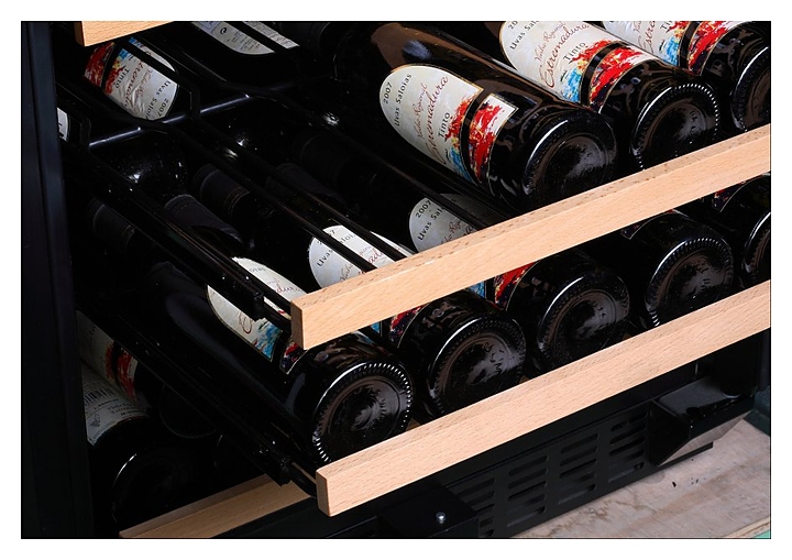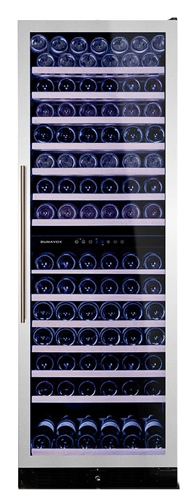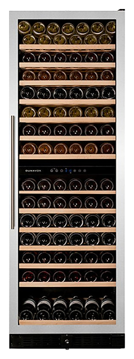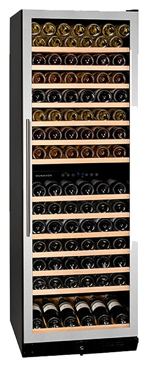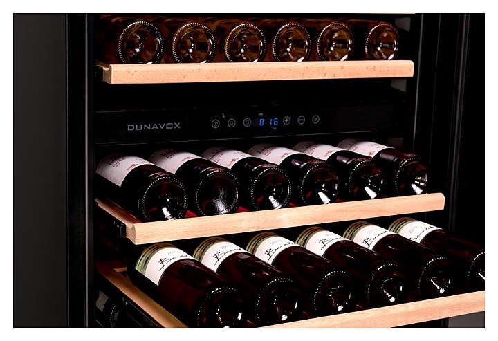 Винный шкаф Dunavox DX-166.428SDSK серии Exclusive предназначен для демонстрации, хранения и создания оптимальных условий для сохранения всех вкусовых свойств вина в бутылках на предприятиях общественного питания, торговли, в барах, ресторанах, специализированных магазинах, частных домах или квартирах. Модель оснащена сенсорной панелью управления и LED-подсветкой синего цвета в каждой зоне. Корпус выполнен из окрашенного металла, дверь - из бесшовной стальной рамы и тонированного стекла с защитой от ультрафиолетовых лучей, выдвижные полки - из нелакированного бука, накладная ручка двери - из нержавеющей стали. Особенности:
