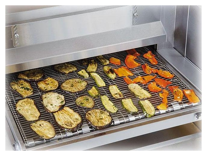 Агрегат является частью первой линии запатентованных вентилируемых конвейерных печей. Устройство очень просто и удобно в использовании: достаточно подготовить продукты, установить необходимую температуру приготовления и задать скорость движения конвейера при помощи цифровой панели управления и поместить продукты на конвейерную ленту. Оператору не потребуется тратить время на контроль процесса приготовления - печь сама позаботится об этом, предотвратив подгорание помещенных в нее блюд. Конструкция прибора позволяет устанавливать печи друг на друга, тем самым экономя пространство кухни и делая его более функциональным.