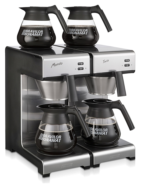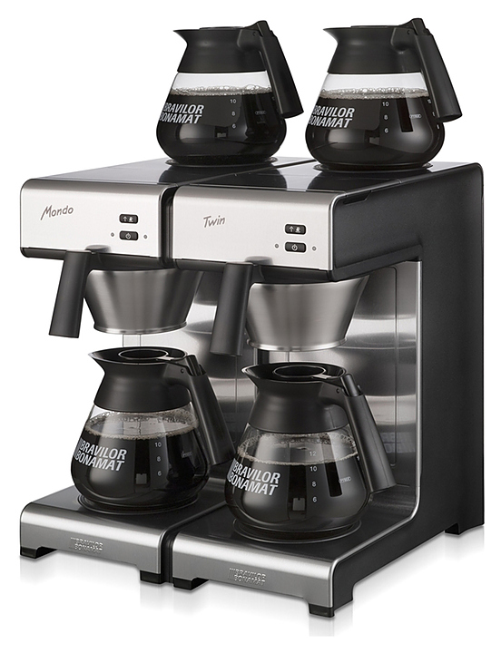 Заливная кофеварка Bravilor Bonamat Mondo Twin используется на предприятиях общественного питания и торговли для приготовления фильтрованного кофе. Модель оснащена 2 системами кофеварения, 4 саморегулируемыми плитами нагрева дна, которые поддерживают оптимальную температуру кофе, индикаторами готовности кофе и удаления накипи. Корпус выполнен из высококачественной нержавеющей стали, черные детали - из синтетических материалов. В комплект поставки входят 4 стеклянных графина и 2 фильтродержателя из нержавеющей стали. Дополнительные характеристики:
