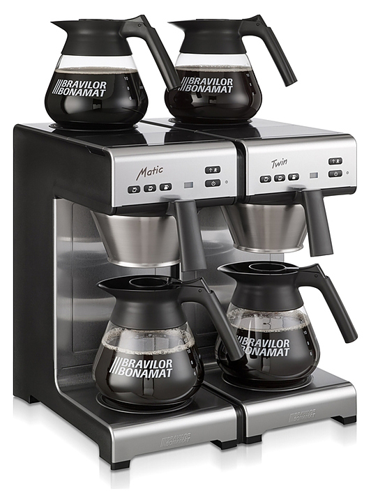Кофеварка Bravilor Bonamat Matic Twin используется на предприятиях общественного питания и торговли для приготовления фильтрованного кофе. Модель оснащена 2 системами кофеварения, 4 саморегулируемыми плитами нагрева дна, которые поддерживают оптимальную температуру кофе, индикаторами готовности кофе и удаления накипи. Корпус выполнен из высококачественной нержавеющей стали, черные детали - из синтетических материалов. В комплект поставки входят 4 стеклянных графина и 2 фильтродержателя из нержавеющей стали. Дополнительные характеристики: