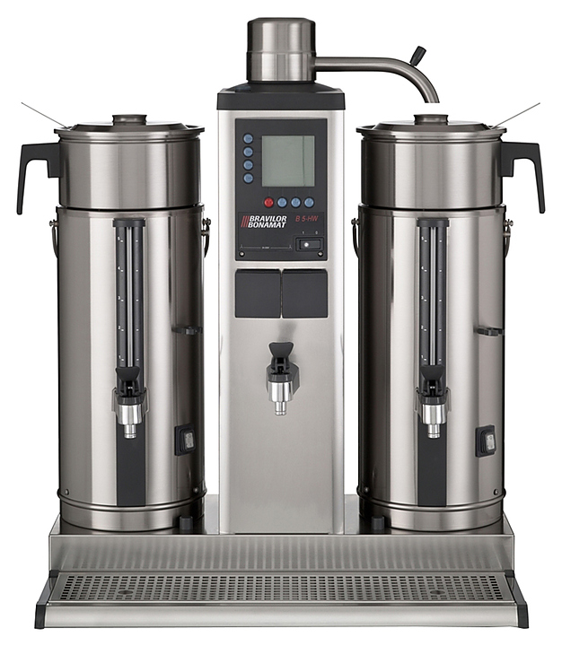 Кофеварка Bravilor Bonamat B5 HW используется на предприятиях общественного питания и торговли для приготовления фильтрованного кофе и горячей воды, предназначенной для супа, каши, чая и других горячих напитков. Модель оснащена цифровым дисплеем, системой кофеварения, 2 емкостями для кофе с подогревом, 2 заварными чашами, отдельным краном горячей воды, индикаторами заполнения, готовности кофе и удаления накипи и поддоном для капель. Корпус выполнен из нержавеющей стали. В комплект поставки входит фильтр из нержавеющей стали. Особенности: