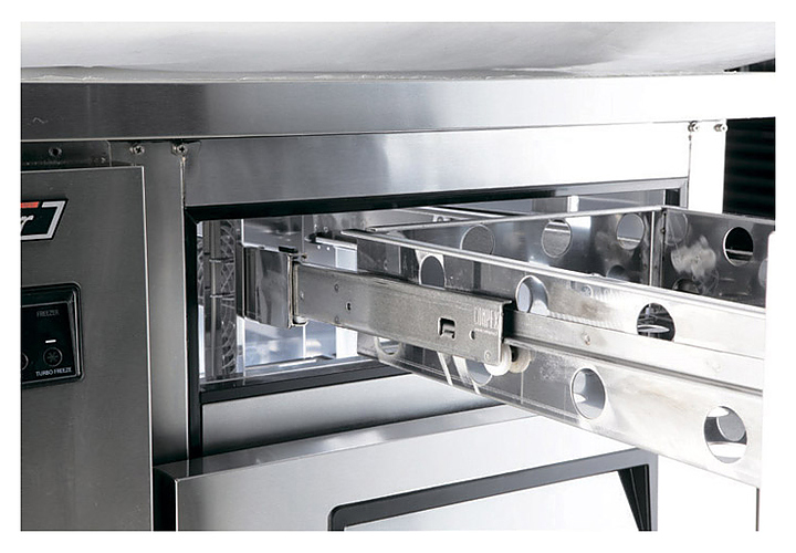 Холодильный стол Turbo air KUR18-3D-9 предназначен для охлаждения и кратковременного хранения скоропортящихся продуктов, теста и ингредиентов для приготовления пиццы в пекарнях, кондитерских, на предприятиях пищевой промышленности, общественного питания и торговли. Модель оснащена 9 ящиками GN 1/1 глубиной 100 мм. Корпус изделия выполнен из нержавеющей стали (гальванизированная сталь на оборотной стороне и внизу) с применением пожаробезопасных стенок толщиной 60 мм, уплотнения - из АБС-пластика (акрилонитрилбутадиенстирола), не пропускающего конденсата, пол - из нержавеющей стали с алюминиевыми вставками по бокам и сзади, 6 регулируемых ножек - из нержавеющей стали. Под заказ возможна модицификация данного оборудования для использования на морских судах. Особенности:
