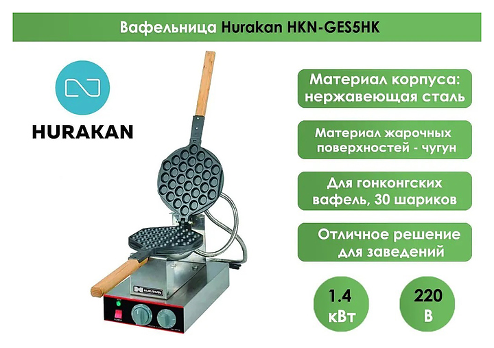 Вафельница Hurakan HKN-GES5HK используется на предприятиях общественного питания и торговли для приготовления гонконгских вафель пузырчатой формы. Модель оснащена регулируемым термостатом. Корпус выполнен из нержавеющей стали, рабочая поверхность - из чугуна. Дополнительные характеристики: