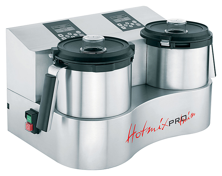 Термомиксер HotmixPRO Gastro Twin используется на предприятиях общественного питания и торговли для измельчения, взбивания, смешивания, поджаривания и пастеризации продуктов при высоких температурах. Модель оснащена 2 коническими чашами. Корпус, ножи и подшипники изготовлены из нержавеющей стали. В комплект поставки входят лопастная мешалка, набор ножей, крышка с мерным стаканом и лопатка. Функции: