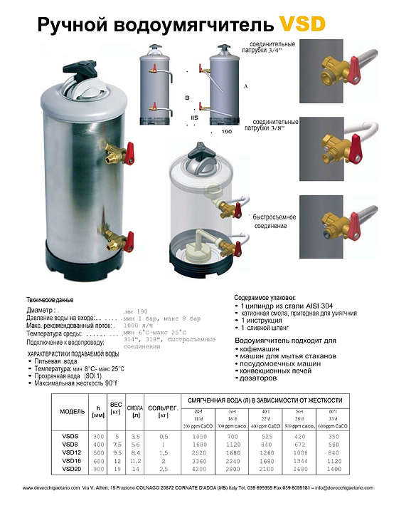 Соляной водоумягчитель Vortmax VSD 12 спользуется на предприятиях общественного питания и торговли для смягчения и декальционирования водопроводной воды совместно с профессиональным кухонным оборудованием, потребляющим низкое количество воды: кофемашинами, посудомоечными и стасаномоечными машинами, конвекционными печами и дозаторами. Изделие оснащено химически активной смолой, регенерируемой с помощью поваренной соли. Корпус выполнен из нержавеющей стали AISI 304. В предварительно очищенной водопроводной воде есть небольшое количество минеральных веществ. Это и есть жесткая вода с высокой концентрацией кальция и магния, представляющая угрозу как для здоровья человека, так и для разнообразной техники. Кальций можно наблюдать в виде отложений на внутренней поверхности нагревательных элементов, водных резервуаров и ТЭНов. Компактная конструкция поместится в угловые и неиспользуемые зоны помещения, не занимая эксплуатируемое пространство. При монтаже необходимо предусмотреть возможность легкого доступа к кранам и верхней части. Дополнительные характеристики: