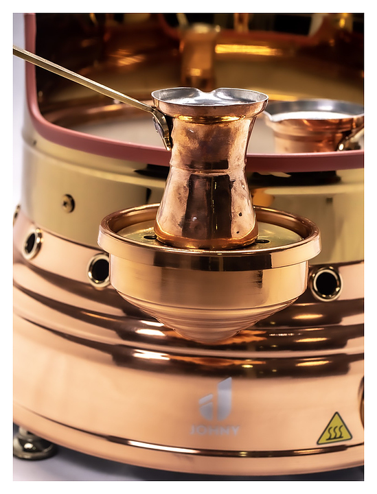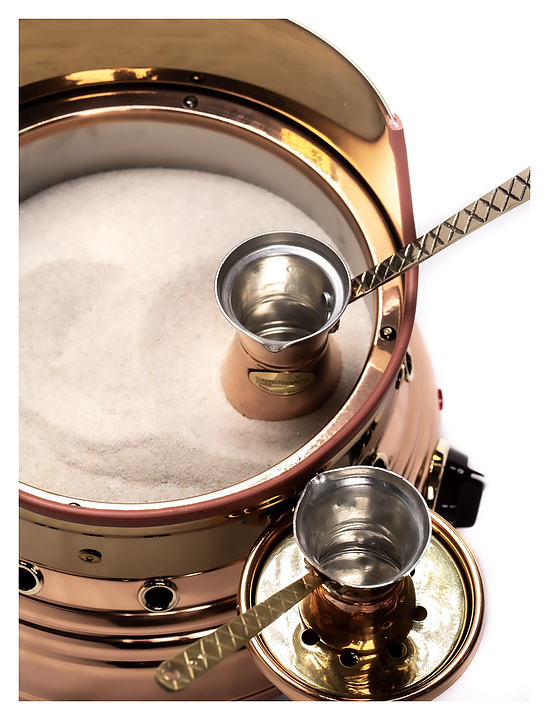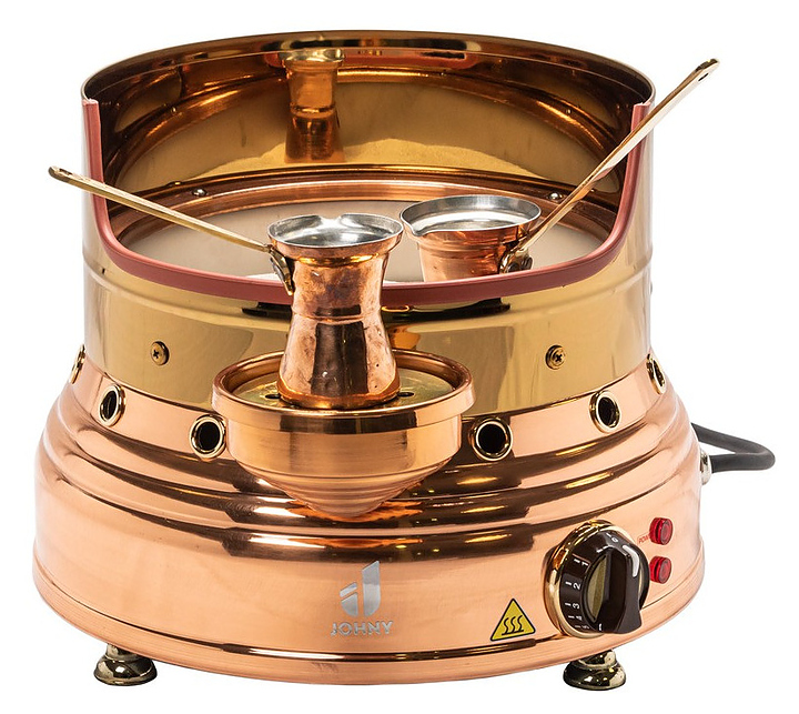 Кофе на песке JOHNY AK/8-1 N используется в специализированных кофейных заведениях для приготовления кофе по-восточному (на песке). В наполненную нагретым до нужной температуры песком платформу устанавливается джезва с водой и перемолотым кофе. Равномерный прогрев, обеспечиваемый нагревательным элементом из алюминия, и медленное томление придают напитку натуральный яркий вкус и насыщенный аромат. В комплект входят 1 джезва из меди и 1 мешочек со специальным песком. Особенности: